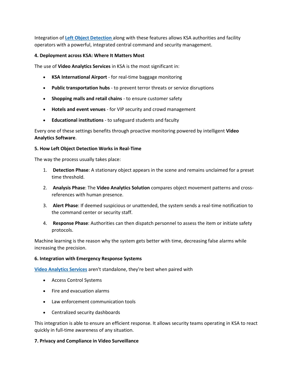 3. Integration of Left Object Detection along with these features allows KSA authorities and facility operators with a powerful, integrated central command and security management. 4. Deployment across KSA: Where It Matters Most The use of Video Analytics Services in KSA is the most significant in: • KSA International Airport - for real-time baggage monitoring • Public transportation hubs - to prevent terror threats or service disruptions • Shopping malls and retail chains - to ensure customer safety • Hotels and event venues - for VIP security and crowd management • Educational institutions - to safeguard students and faculty Every one of these settings benefits through proactive monitoring powered by intelligent Video Analytics Software. 5. How Left Object Detection Works in Real-Time The way the process usually takes place: 1.Detection Phase: A stationary object appears in the scene and remains unclaimed for a preset time threshold. 2.Analysis Phase: The Video Analytics Solution compares object movement patterns and cross- references with human presence. 3.Alert Phase: If deemed suspicious or unattended, the system sends a real-time notification to the command center or security staff. 4.Response Phase: Authorities can then dispatch personnel to assess the item or initiate safety protocols. Machine learning is the reason why the system gets better with time, decreasing false alarms while increasing the precision. 6. Integration with Emergency Response Systems Video Analytics Services aren't standalone, they're best when paired with • Access Control Systems • Fire and evacuation alarms • Law enforcement communication tools • Centralized security dashboards This integration is able to ensure an efficient response. It allows security teams operating in KSA to react quickly in full-time awareness of any situation. 7. Privacy and Compliance in Video Surveillance
