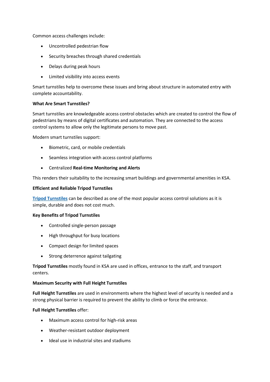 2. Common access challenges include: • Uncontrolled pedestrian flow • Security breaches through shared credentials • Delays during peak hours • Limited visibility into access events Smart turnstiles help to overcome these issues and bring about structure in automated entry with complete accountability. What Are Smart Turnstiles? Smart turnstiles are knowledgeable access control obstacles which are created to control the flow of pedestrians by means of digital certificates and automation. They are connected to the access control systems to allow only the legitimate persons to move past. Modern smart turnstiles support: • Biometric, card, or mobile credentials • Seamless integration with access control platforms • Centralized Real-time Monitoring and Alerts This renders their suitability to the increasing smart buildings and governmental amenities in KSA. Efficient and Reliable Tripod Turnstiles Tripod Turnstiles can be described as one of the most popular access control solutions as it is simple, durable and does not cost much. Key Benefits of Tripod Turnstiles • Controlled single-person passage • High throughput for busy locations • Compact design for limited spaces • Strong deterrence against tailgating Tripod Turnstiles mostly found in KSA are used in offices, entrance to the staff, and transport centers. Maximum Security with Full Height Turnstiles Full Height Turnstiles are used in environments where the highest level of security is needed and a strong physical barrier is required to prevent the ability to climb or force the entrance. Full Height Turnstiles offer: • Maximum access control for high-risk areas • Weather-resistant outdoor deployment • Ideal use in industrial sites and stadiums