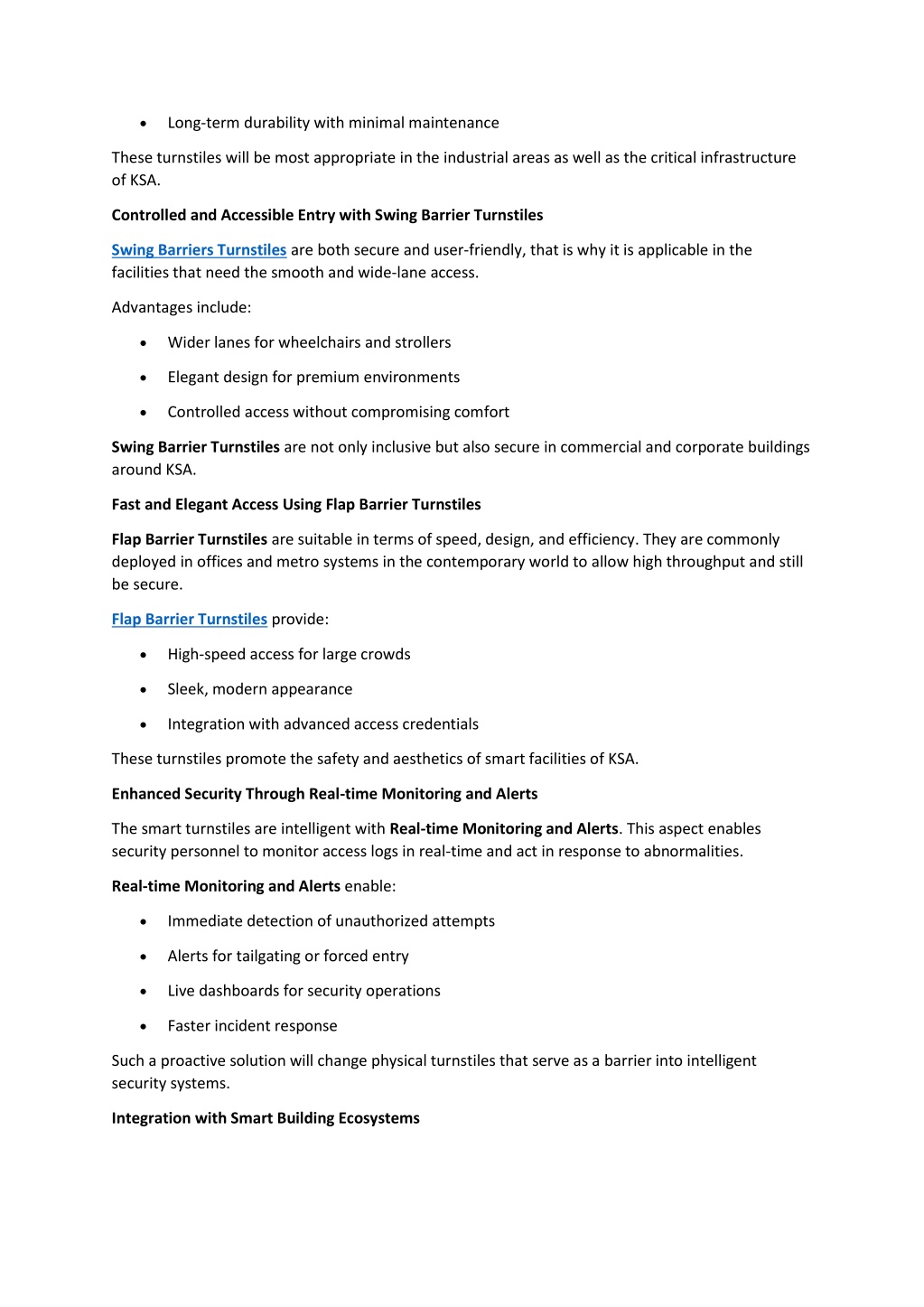 4. Smart turnstiles are easily introduced to access control platforms, visitor management systems, and building management systems. This forms an integrated security ecosystem, in which pedestrian access is coordinated with the overall facilities. Integration benefits include: • Centralized access control • Data-driven security decisions • Scalable deployment across multiple sites Why Smart Turnstiles Are Ideal for KSA The smart cities and safe infrastructure that KSA seeks requires the future-ready, scalable and reliable solutions. Smart turnstiles deliver: • Enhanced pedestrian security • Efficient crowd management • Improved user experience • Long-term operational efficiency Organizations have the chance to select solutions customized to their needs because of such options as Tripod Turnstiles, Full Height Turnstiles, Swing Barrier Turnstiles, and Flap Barrier Turnstiles. Industries Benefiting from Smart Turnstiles in Kuwait Smart turnstiles are actively used throughout: • Corporate offices and business parks • Government buildings • Metro stations and transport hubs • Stadiums and event venues • Industrial and energy facilities Intelligent turnstile systems are useful in any place that has to be restricted in terms of pedestrian access. The Future of Pedestrian Security in Kuwait With the development of technology, smart turnstiles will continue to be developed to include AI- based analytics, future alerts, and integration into the smart city systems. The proactive security strategies will continue to focus on real-time monitoring and alerts. The use of smart turnstiles is no longer optional, and it is the cornerstone of the safe and efficient infrastructure of KSA. Conclusion Smart Turnstiles: Ultimate Security Gateway to KSA will be the joint venture of both physical security and intelligent control. Through the installation of Tripod Turnstiles, Full Height Turnstiles,