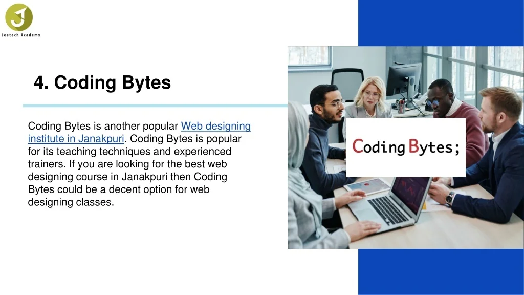 4. Coding Bytes Coding Bytes is another popular Web designing institute in Janakpuri. Coding Bytes is popular for its teaching techniques and experienced trainers. If you are looking for the best web designing course in Janakpuri then Coding Bytes could be a decent option for web designing classes.