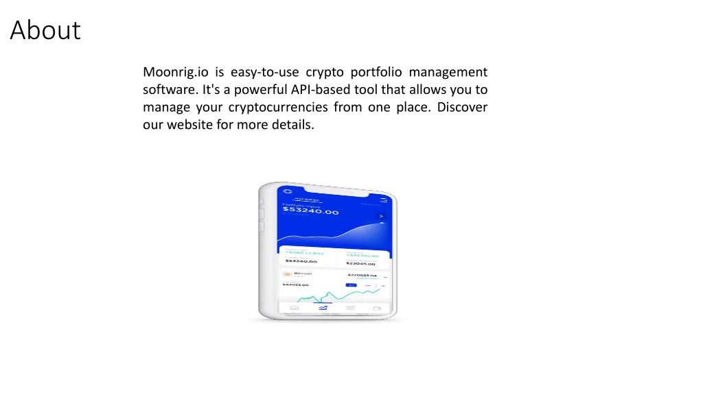 About Moonrig.io is easy-to-use crypto portfolio management software. It's a powerful API-based tool that allows you to manage your cryptocurrencies from one place. Discover our website for more details.