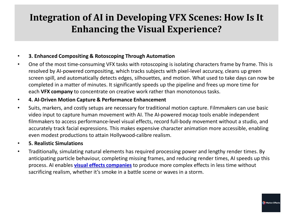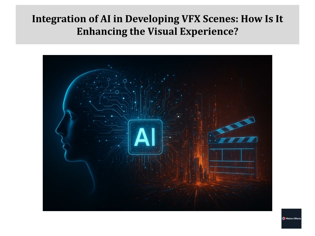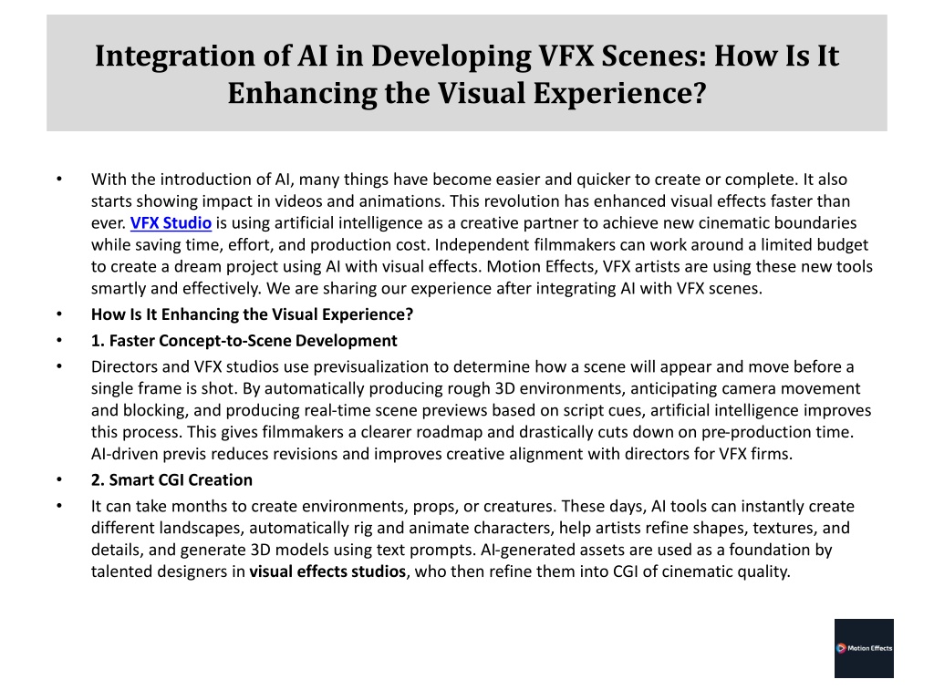 Integration of AI in Developing VFX Scenes: How Is It Enhancing the Visual Experience? • With the introduction of AI, many things have become easier and quicker to create or complete. It also starts showing impact in videos and animations. This revolution has enhanced visual effects faster than ever. VFX Studio is using artificial intelligence as a creative partner to achieve new cinematic boundaries while saving time, effort, and production cost. Independent filmmakers can work around a limited budget to create a dream project using AI with visual effects. Motion Effects, VFX artists are using these new tools smartly and effectively. We are sharing our experience after integrating AI with VFX scenes. • How Is It Enhancing the Visual Experience? • 1. Faster Concept-to-Scene Development • Directors and VFX studios use previsualization to determine how a scene will appear and move before a single frame is shot. By automatically producing rough 3D environments, anticipating camera movement and blocking, and producing real-time scene previews based on script cues, artificial intelligence improves this process. This gives filmmakers a clearer roadmap and drastically cuts down on pre-production time. AI-driven previs reduces revisions and improves creative alignment with directors for VFX firms. • 2. Smart CGI Creation • It can take months to create environments, props, or creatures. These days, AI tools can instantly create different landscapes, automatically rig and animate characters, help artists refine shapes, textures, and details, and generate 3D models using text prompts. AI-generated assets are used as a foundation by talented designers in visual effects studios, who then refine them into CGI of cinematic quality.