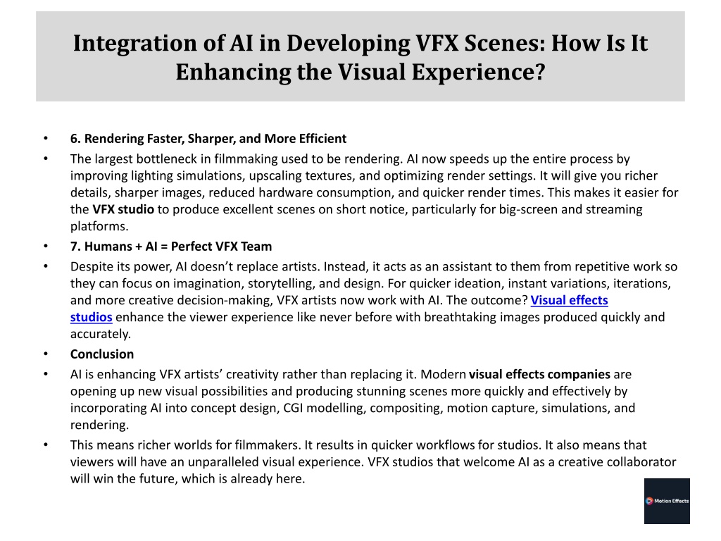 Integration of AI in Developing VFX Scenes: How Is It Enhancing the Visual Experience? • 6. Rendering Faster, Sharper, and More Efficient • The largest bottleneck in filmmaking used to be rendering. AI now speeds up the entire process by improving lighting simulations, upscaling textures, and optimizing render settings. It will give you richer details, sharper images, reduced hardware consumption, and quicker render times. This makes it easier for the VFX studio to produce excellent scenes on short notice, particularly for big-screen and streaming platforms. • 7. Humans + AI = Perfect VFX Team • Despite its power, AI doesn’t replace artists. Instead, it acts as an assistant to them from repetitive work so they can focus on imagination, storytelling, and design. For quicker ideation, instant variations, iterations, and more creative decision-making, VFX artists now work with AI. The outcome? Visual effects studios enhance the viewer experience like never before with breathtaking images produced quickly and accurately. • Conclusion • AI is enhancing VFX artists’ creativity rather than replacing it. Modern visual effects companies are opening up new visual possibilities and producing stunning scenes more quickly and effectively by incorporating AI into concept design, CGI modelling, compositing, motion capture, simulations, and rendering. • This means richer worlds for filmmakers. It results in quicker workflows for studios. It also means that viewers will have an unparalleled visual experience. VFX studios that welcome AI as a creative collaborator will win the future, which is already here.