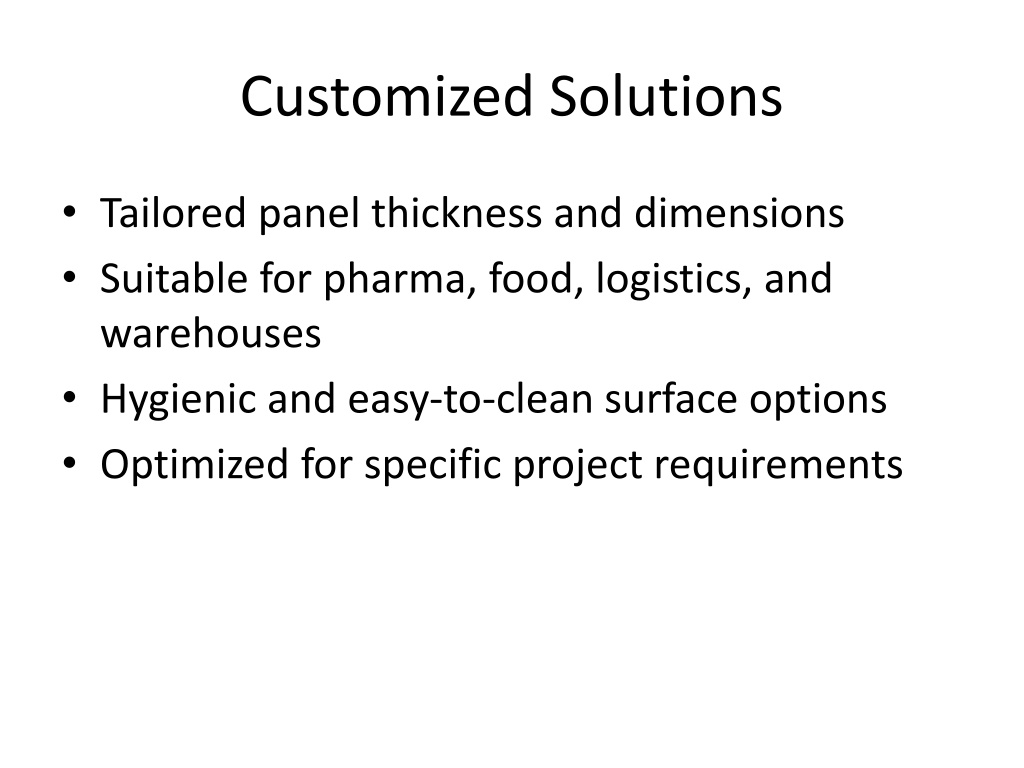 Customized Solutions • Tailored panel thickness and dimensions • Suitable for pharma, food, logistics, and warehouses • Hygienic and easy-to-clean surface options • Optimized for specific project requirements