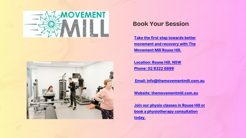7. Book Your Session Take the first step towards better movement and recovery with The Movement Mill Rouse Hill. Location: Rouse Hill, NSW Phone: 02 8322 6899 Email: info@themovementmill.com.au Website: themovementmill.com.au Join our physio classes in Rouse Hill or book a physiotherapy consultation today.