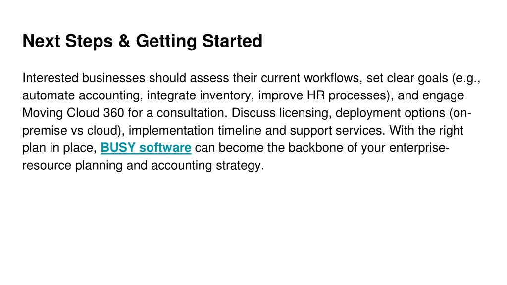 7. Next Steps & Getting Started Interested businesses should assess their current workflows, set clear goals (e.g., automate accounting, integrate inventory, improve HR processes), and engage Moving Cloud 360 for a consultation. Discuss licensing, deployment options (on-premise vs cloud), implementation timeline and support services. With the right plan in place, BUSY software can become the backbone of your enterprise-resource planning and accounting strategy.