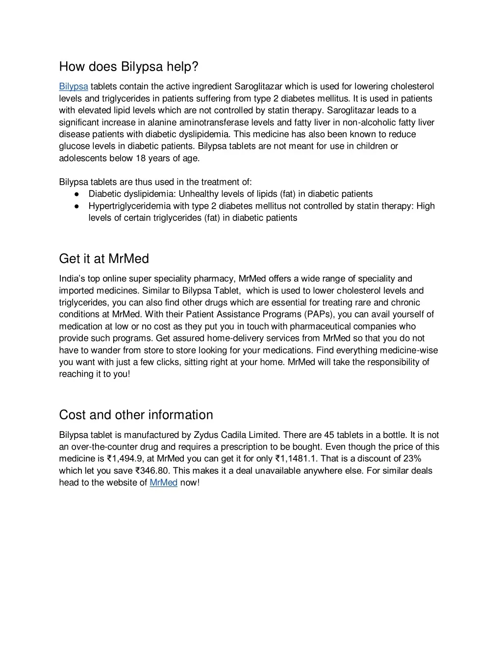 How does Bilypsa help? Bilypsa tablets contain the active ingredient Saroglitazar which is used for lowering cholesterol levels and triglycerides in patients suffering from type 2 diabetes mellitus. It is used in patients with elevated lipid levels which are not controlled by statin therapy. Saroglitazar leads to a significant increase in alanine aminotransferase levels and fatty liver in non-alcoholic fatty liver disease patients with diabetic dyslipidemia. This medicine has also been known to reduce glucose levels in diabetic patients. Bilypsa tablets are not meant for use in children or adolescents below 18 years of age. Bilypsa tablets are thus used in the treatment of: ● Diabetic dyslipidemia: Unhealthy levels of lipids (fat) in diabetic patients ● Hypertriglyceridemia with type 2 diabetes mellitus not controlled by statin therapy: High levels of certain triglycerides (fat) in diabetic patients Get it at MrMed India’s top online super speciality pharmacy, MrMed offers a wide range of speciality and imported medicines. Similar to Bilypsa Tablet, which is used to lower cholesterol levels and triglycerides, you can also find other drugs which are essential for treating rare and chronic conditions at MrMed. With their Patient Assistance Programs (PAPs), you can avail yourself of medication at low or no cost as they put you in touch with pharmaceutical companies who provide such programs. Get assured home-delivery services from MrMed so that you do not have to wander from store to store looking for your medications. Find everything medicine-wise you want with just a few clicks, sitting right at your home. MrMed will take the responsibility of reaching it to you! Cost and other information Bilypsa tablet is manufactured by Zydus Cadila Limited. There are 45 tablets in a bottle. It is not an over-the-counter drug and requires a prescription to be bought. Even though the price of this medicine is ₹1,494.9, at MrMed you can get it for only ₹1,1481.1. That is a discount of 23% which let you save ₹346.80. This makes it a deal unavailable anywhere else. For similar deals head to the website of MrMed now!