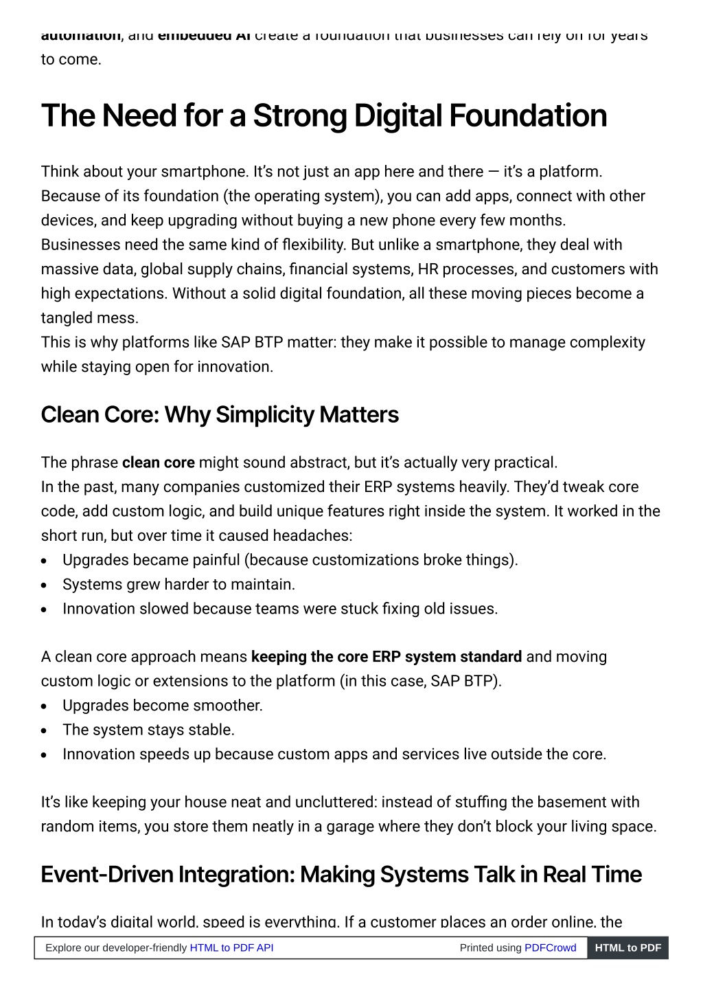 automation, and embedded AI create a foundation that businesses can rely on for years to come. TheNeedforaStrongDigitalFoundation Think about your smartphone. It’s not just an app here and there — it’s a platform. Because of its foundation (the operating system), you can add apps, connect with other devices, and keep upgrading without buying a new phone every few months. Businesses need the same kind of ?exibility. But unlike a smartphone, they deal with massive data, global supply chains, ?nancial systems, HR processes, and customers with high expectations. Without a solid digital foundation, all these moving pieces become a tangled mess. This is why platforms like SAP BTP matter: they make it possible to manage complexity while staying open for innovation. CleanCore: WhySimplicityMatters The phrase clean core might sound abstract, but it’s actually very practical. In the past, many companies customized their ERP systems heavily. They’d tweak core code, add custom logic, and build unique features right inside the system. It worked in the short run, but over time it caused headaches: Upgrades became painful (because customizations broke things). Systems grew harder to maintain. Innovation slowed because teams were stuck ?xing old issues. A clean core approach means keeping the core ERP system standard and moving custom logic or extensions to the platform (in this case, SAP BTP). Upgrades become smoother. The system stays stable. Innovation speeds up because custom apps and services live outside the core. It’s like keeping your house neat and uncluttered: instead of stu?ng the basement with random items, you store them neatly in a garage where they don’t block your living space. Event-DrivenIntegration: MakingSystemsTalkinRealTime In today’s digital world, speed is everything. If a customer places an order online, the Explore our developer-friendly HTML to PDF API Printed using PDFCrowd HTML to PDF