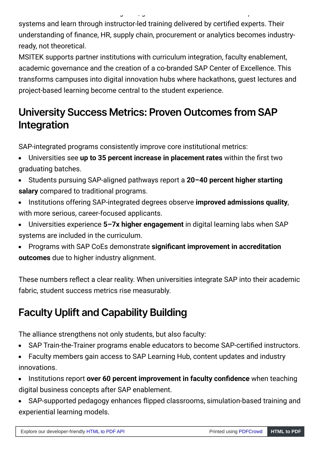 g , g p systems and learn through instructor-led training delivered by certi?ed experts. Their understanding of ?nance, HR, supply chain, procurement or analytics becomes industry- ready, not theoretical. MSITEK supports partner institutions with curriculum integration, faculty enablement, academic governance and the creation of a co-branded SAP Center of Excellence. This transforms campuses into digital innovation hubs where hackathons, guest lectures and project-based learning become central to the student experience. UniversitySuccessMetrics: ProvenOutcomesfromSAP Integration SAP-integrated programs consistently improve core institutional metrics: Universities see up to 35 percent increase in placement rates within the ?rst two graduating batches. Students pursuing SAP-aligned pathways report a 20–40 percent higher starting salary compared to traditional programs. Institutions offering SAP-integrated degrees observe improved admissions quality, with more serious, career-focused applicants. Universities experience 5–7x higher engagement in digital learning labs when SAP systems are included in the curriculum. Programs with SAP CoEs demonstrate signi?cant improvement in accreditation outcomes due to higher industry alignment. These numbers re?ect a clear reality. When universities integrate SAP into their academic fabric, student success metrics rise measurably. FacultyUpliftandCapabilityBuilding The alliance strengthens not only students, but also faculty: SAP Train-the-Trainer programs enable educators to become SAP-certi?ed instructors. Faculty members gain access to SAP Learning Hub, content updates and industry innovations. Institutions report over 60 percent improvement in faculty con?dence when teaching digital business concepts after SAP enablement. SAP-supported pedagogy enhances ?ipped classrooms, simulation-based training and experiential learning models. Explore our developer-friendly HTML to PDF API Printed using PDFCrowd HTML to PDF