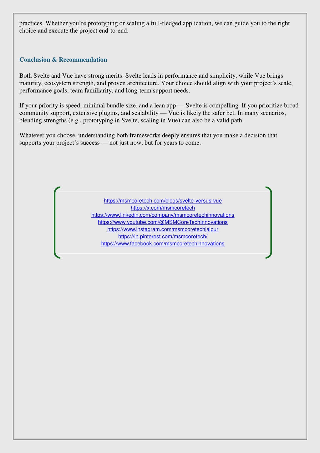 practices. Whether you’re prototyping or scaling a full-fledged application, we can guide you to the right choice and execute the project end-to-end. Conclusion & Recommendation Both Svelte and Vue have strong merits. Svelte leads in performance and simplicity, while Vue brings maturity, ecosystem strength, and proven architecture. Your choice should align with your project’s scale, performance goals, team familiarity, and long-term support needs. If your priority is speed, minimal bundle size, and a lean app — Svelte is compelling. If you prioritize broad community support, extensive plugins, and scalability — Vue is likely the safer bet. In many scenarios, blending strengths (e.g., prototyping in Svelte, scaling in Vue) can also be a valid path. Whatever you choose, understanding both frameworks deeply ensures that you make a decision that supports your project’s success — not just now, but for years to come. https://msmcoretech.com/blogs/svelte-versus-vue https://x.com/msmcoretech https://www.linkedin.com/company/msmcoretechinnovations https://www.youtube.com/@MSMCoreTechInnovations https://www.instagram.com/msmcoretechjaipur https://in.pinterest.com/msmcoretech/ https://www.facebook.com/msmcoretechinnovations