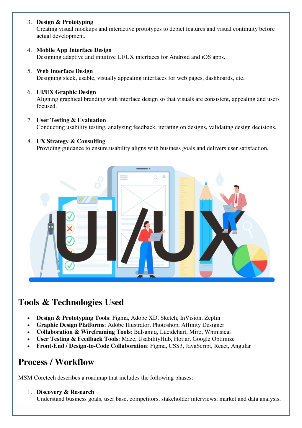 3.Design & Prototyping Creating visual mockups and interactive prototypes to depict features and visual continuity before actual development. 4.Mobile App Interface Design Designing adaptive and intuitive UI/UX interfaces for Android and iOS apps. 5.Web Interface Design Designing sleek, usable, visually appealing interfaces for web pages, dashboards, etc. 6.UI/UX Graphic Design Aligning graphical branding with interface design so that visuals are consistent, appealing and user- focused. 7.User Testing & Evaluation Conducting usability testing, analyzing feedback, iterating on designs, validating design decisions. 8.UX Strategy & Consulting Providing guidance to ensure usability aligns with business goals and delivers user satisfaction. Tools & Technologies Used Design & Prototyping Tools: Figma, Adobe XD, Sketch, InVision, Zeplin Graphic Design Platforms: Adobe Illustrator, Photoshop, Affinity Designer Collaboration & Wireframing Tools: Balsamiq, Lucidchart, Miro, Whimsical User Testing & Feedback Tools: Maze, UsabilityHub, Hotjar, Google Optimize Front-End / Design-to-Code Collaboration: Figma, CSS3, JavaScript, React, Angular Process / Workflow MSM Coretech describes a roadmap that includes the following phases: 1.Discovery & Research Understand business goals, user base, competitors, stakeholder interviews, market and data analysis.