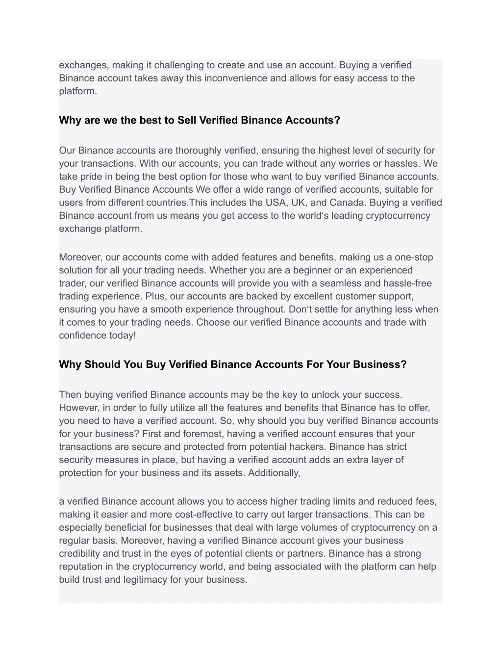 exchanges, making it challenging to create and use an account. Buying a verified Binance account takes away this inconvenience and allows for easy access to the platform. Why are we the best to Sell Verified Binance Accounts? Our Binance accounts are thoroughly verified, ensuring the highest level of security for your transactions. With our accounts, you can trade without any worries or hassles. We take pride in being the best option for those who want to buy verified Binance accounts. Buy Verified Binance Accounts We offer a wide range of verified accounts, suitable for users from different countries.This includes the USA, UK, and Canada. Buying a verified Binance account from us means you get access to the world‘s leading cryptocurrency exchange platform. Moreover, our accounts come with added features and benefits, making us a one-stop solution for all your trading needs. Whether you are a beginner or an experienced trader, our verified Binance accounts will provide you with a seamless and hassle-free trading experience. Plus, our accounts are backed by excellent customer support, ensuring you have a smooth experience throughout. Don‘t settle for anything less when it comes to your trading needs. Choose our verified Binance accounts and trade with confidence today! Why Should You Buy Verified Binance Accounts For Your Business? Then buying verified Binance accounts may be the key to unlock your success. However, in order to fully utilize all the features and benefits that Binance has to offer, you need to have a verified account. So, why should you buy verified Binance accounts for your business? First and foremost, having a verified account ensures that your transactions are secure and protected from potential hackers. Binance has strict security measures in place, but having a verified account adds an extra layer of protection for your business and its assets. Additionally, a verified Binance account allows you to access higher trading limits and reduced fees, making it easier and more cost-effective to carry out larger transactions. This can be especially beneficial for businesses that deal with large volumes of cryptocurrency on a regular basis. Moreover, having a verified Binance account gives your business credibility and trust in the eyes of potential clients or partners. Binance has a strong reputation in the cryptocurrency world, and being associated with the platform can help build trust and legitimacy for your business.