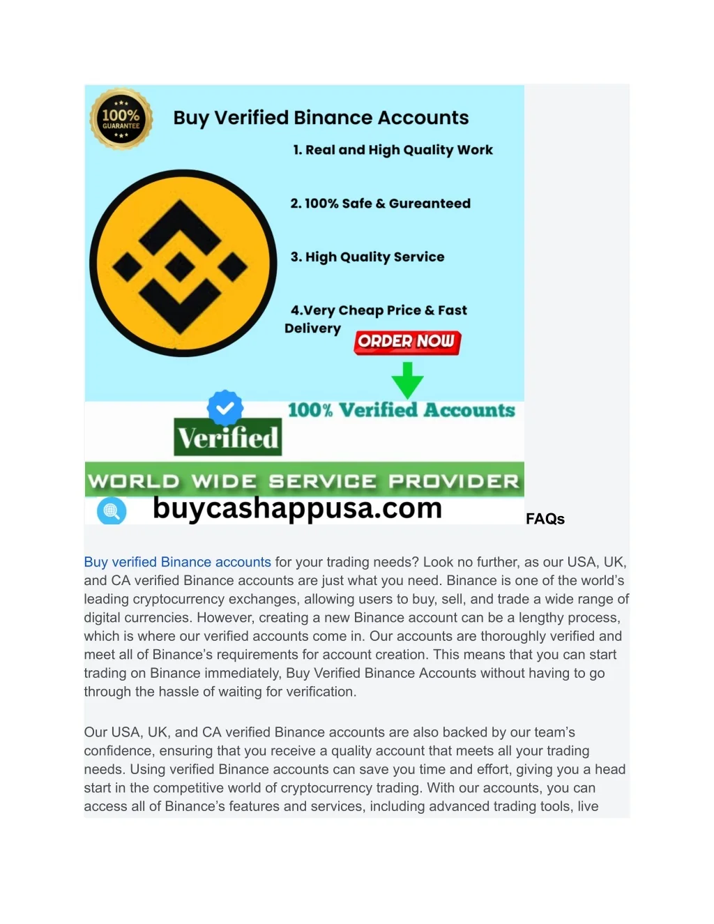 Buy Verified Binance Accounts Looking to Buy Verified Binance Accountst USA? Look no further! OurVerified Binance Accountst offer peace of mind and security for your transactions. With a verified account, you can send and receive money without worrying about fraud or scams. Plus, our accounts are affordable and easy to use. Don’t wait – Buy Verified Binance Accounts today and start enjoying the benefits of secure, hassle-free transactions!We are working with the largest team and we are instant start work after your place order. So, Buy our Service and enjoy it. Why will you buy my service? 100% Customers Satisfaction Guaranteed. All Documents Fully Verified All Documents Provide With Accounts Very Cheap Price. High-Quality Service. 100% Money-Back Guarantee. 24/7 Ready to Customer Support. Extra Bonuses for every service. If you want to buy this product, you must Advance Payment. Contact for any assistance and product inquiries. we are online 24/7 hours. Telegram: @buycashappusa Skype: Customer Support Email: buycashappusa@gmail.com Buy Verified Binance Accounts