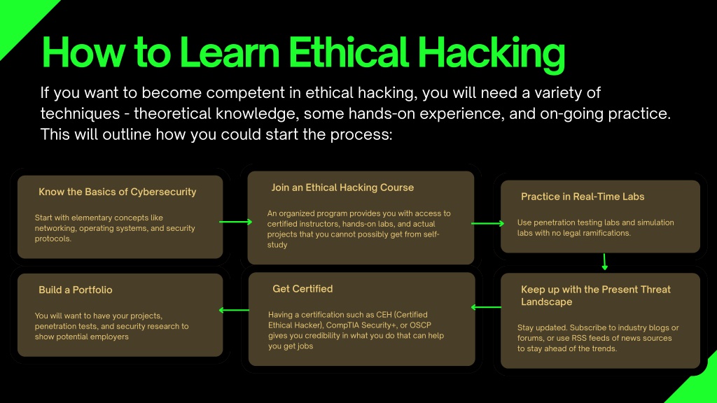 How to Learn Ethical Hacking If you want to become competent in ethical hacking, you will need a variety of techniques - theoretical knowledge, some hands-on experience, and on-going practice. This will outline how you could start the process: Join an Ethical Hacking Course Know the Basics of Cybersecurity Practice in Real-Time Labs An organized program provides you with access to certified instructors, hands-on labs, and actual projects that you cannot possibly get from self- study Start with elementary concepts like networking, operating systems, and security protocols. Use penetration testing labs and simulation labs with no legal ramifications. Get Certified Keep up with the Present Threat Landscape Build a Portfolio Having a certification such as CEH (Certified Ethical Hacker), CompTIA Security+, or OSCP gives you credibility in what you do that can help you get jobs You will want to have your projects, penetration tests, and security research to show potential employers Stay updated. Subscribe to industry blogs or forums, or use RSS feeds of news sources to stay ahead of the trends.