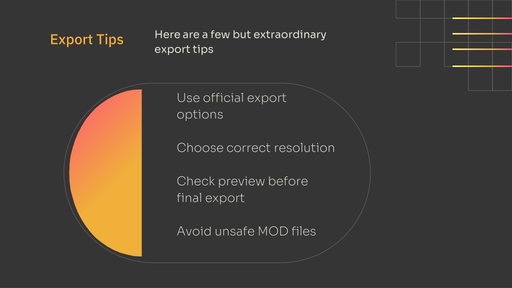 9. Export Tips Here are a few but extraordinary export tips 2 Use official export options Choose correct resolution Check preview before final export Avoid unsafe MOD files