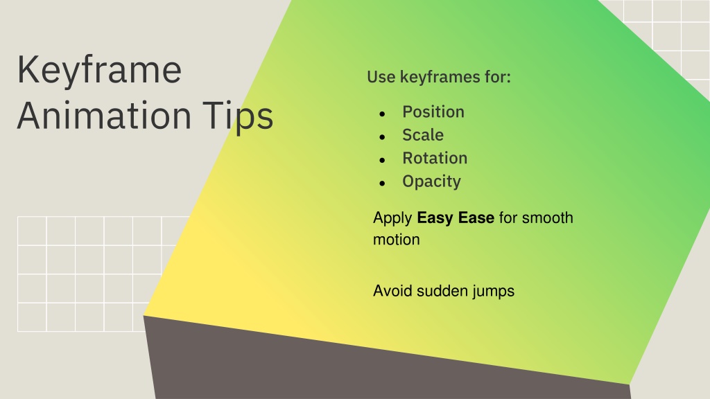 5. Keyframe Animation Tips Use keyframes for: • Position • Scale • Rotation • Opacity Apply Easy Ease for smooth motion Avoid sudden jumps