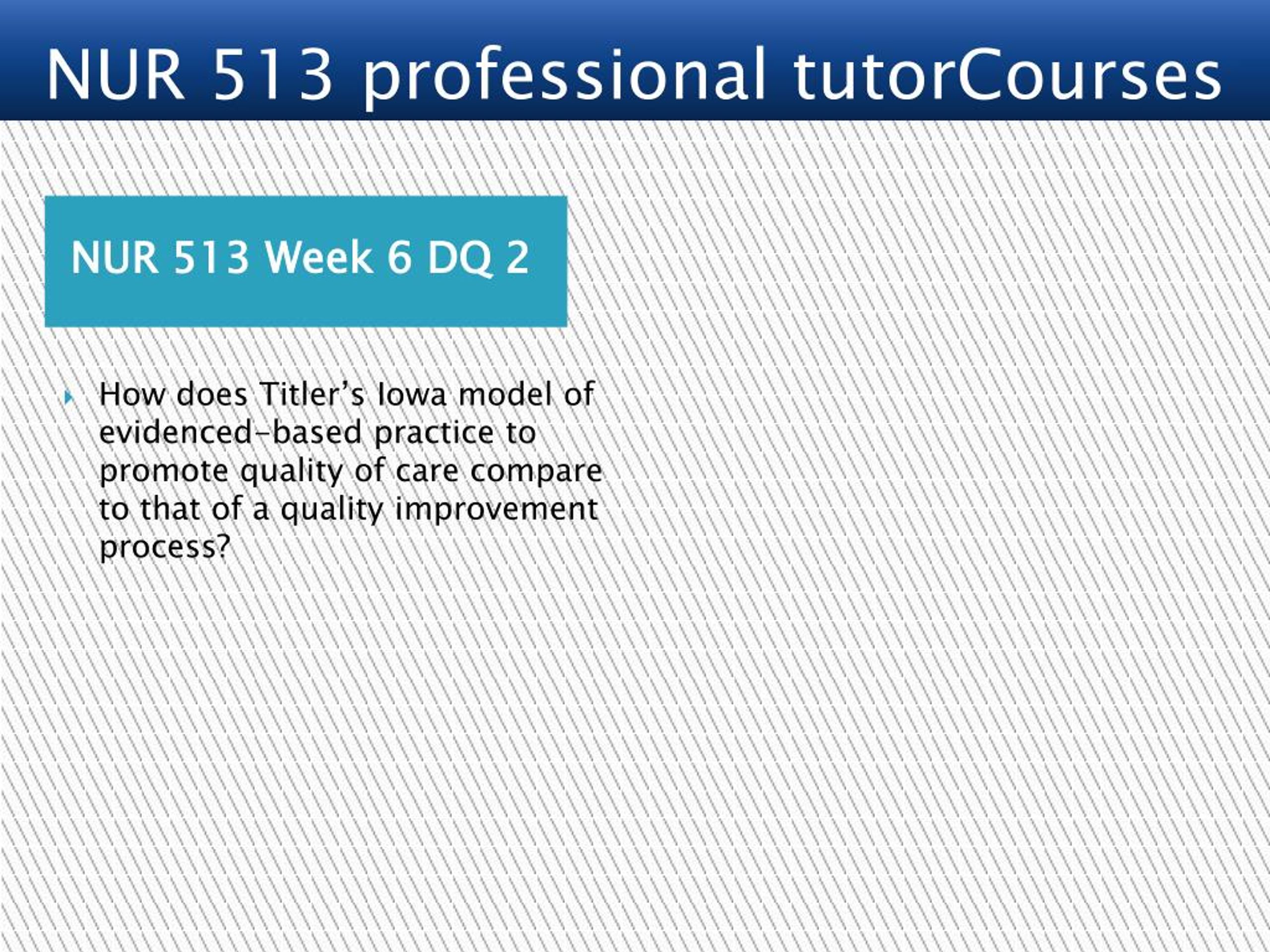 NUR 513 Week 6 DQ 2 NUR 513 professional tutorCourses How does Titler’s Iowa model of evidenced-based practice to promote quality of care compare to that of a quality improvement process?