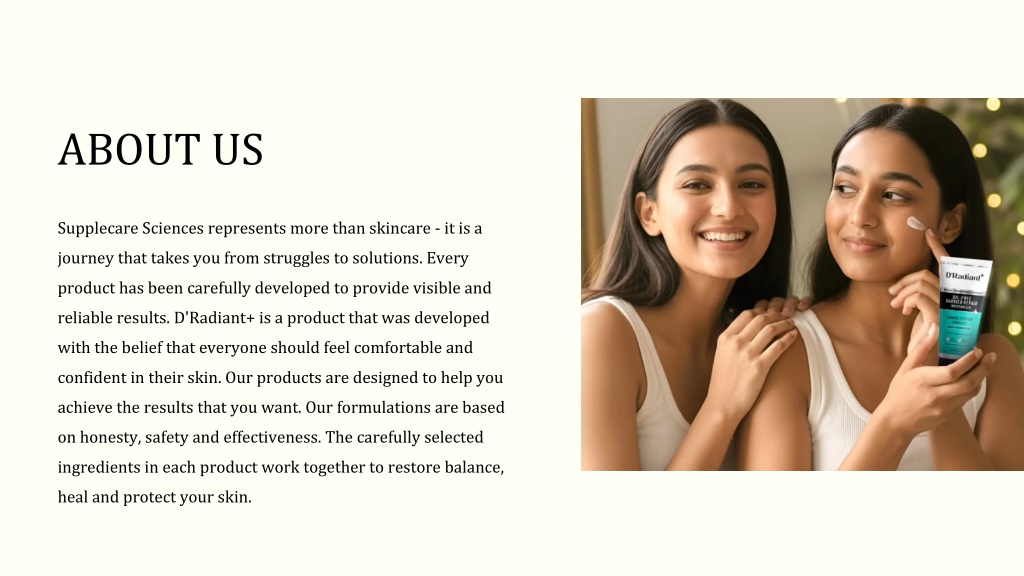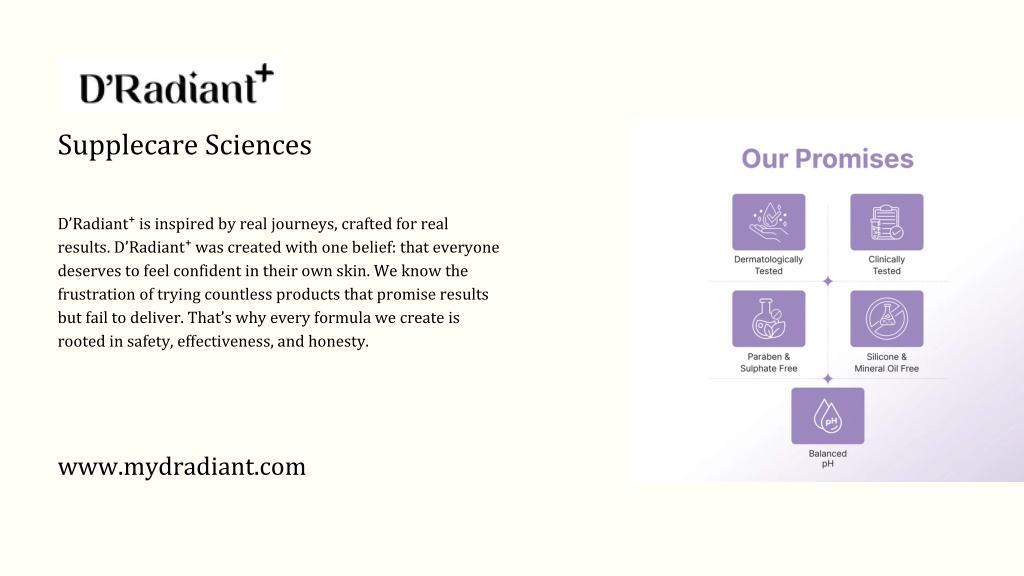 ABOUT US Supplecare Sciences represents more than skincare - it is a journey that takes you from struggles to solutions. Every product has been carefully developed to provide visible and reliable results. D'Radiant+ is a product that was developed with the belief that everyone should feel comfortable and confident in their skin. Our products are designed to help you achieve the results that you want. Our formulations are based on honesty, safety and effectiveness. The carefully selected ingredients in each product work together to restore balance, heal and protect your skin.