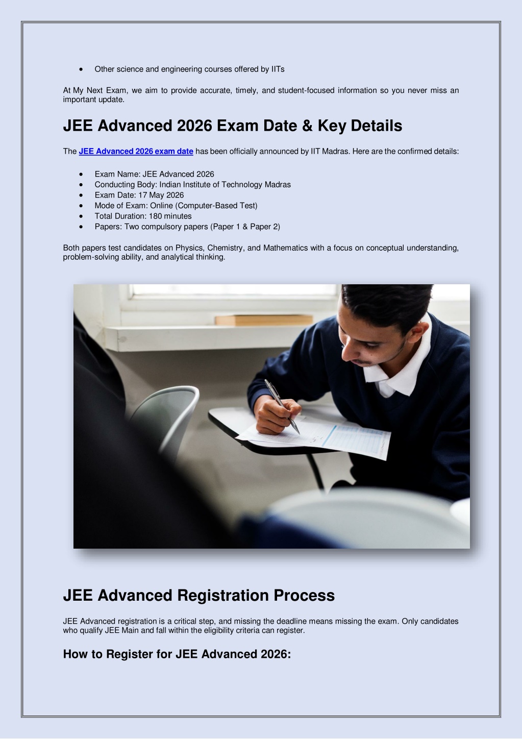 Other science and engineering courses offered by IITs At My Next Exam, we aim to provide accurate, timely, and student-focused information so you never miss an important update. JEE Advanced 2026 Exam Date & Key Details The JEE Advanced 2026 exam date has been officially announced by IIT Madras. Here are the confirmed details: Exam Name: JEE Advanced 2026 Conducting Body: Indian Institute of Technology Madras Exam Date: 17 May 2026 Mode of Exam: Online (Computer-Based Test) Total Duration: 180 minutes Papers: Two compulsory papers (Paper 1 & Paper 2) Both papers test candidates on Physics, Chemistry, and Mathematics with a focus on conceptual understanding, problem-solving ability, and analytical thinking. JEE Advanced Registration Process JEE Advanced registration is a critical step, and missing the deadline means missing the exam. Only candidates who qualify JEE Main and fall within the eligibility criteria can register. How to Register for JEE Advanced 2026: