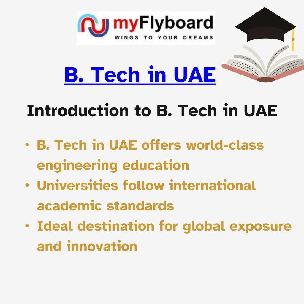 Explore your future with a B. Tech in UAE through My Flyboard roles, guiding students to top universities, industry-focused learning, global exposure, scholarships, and career pathways in engineering, innovation careers.<br><br>Visit: https://myflyboard.com/course/b-tech