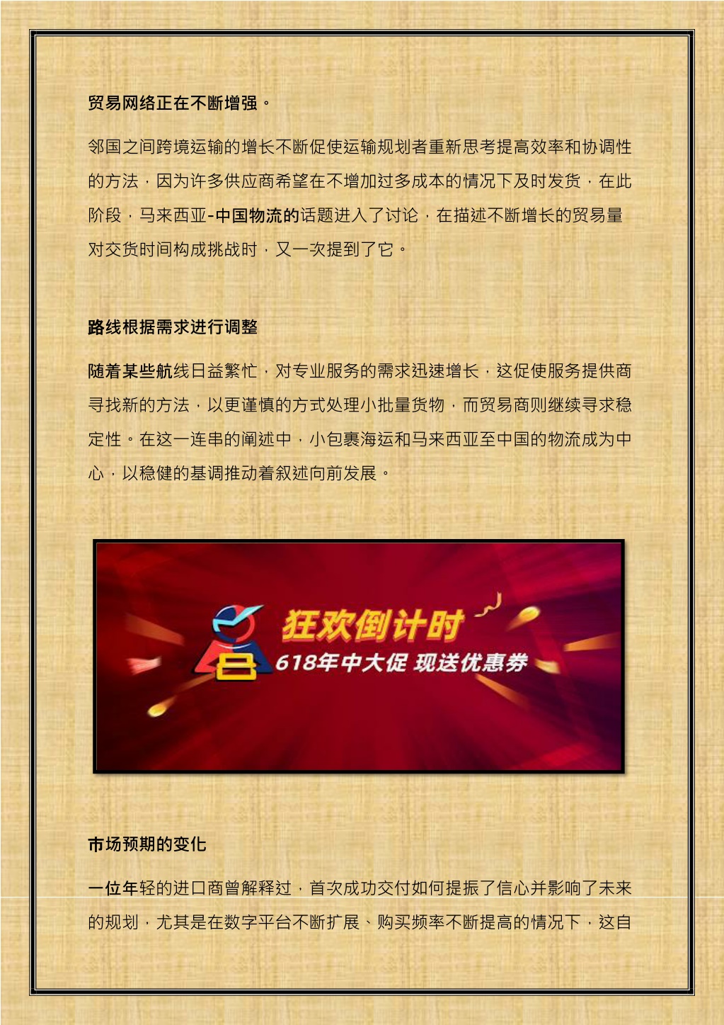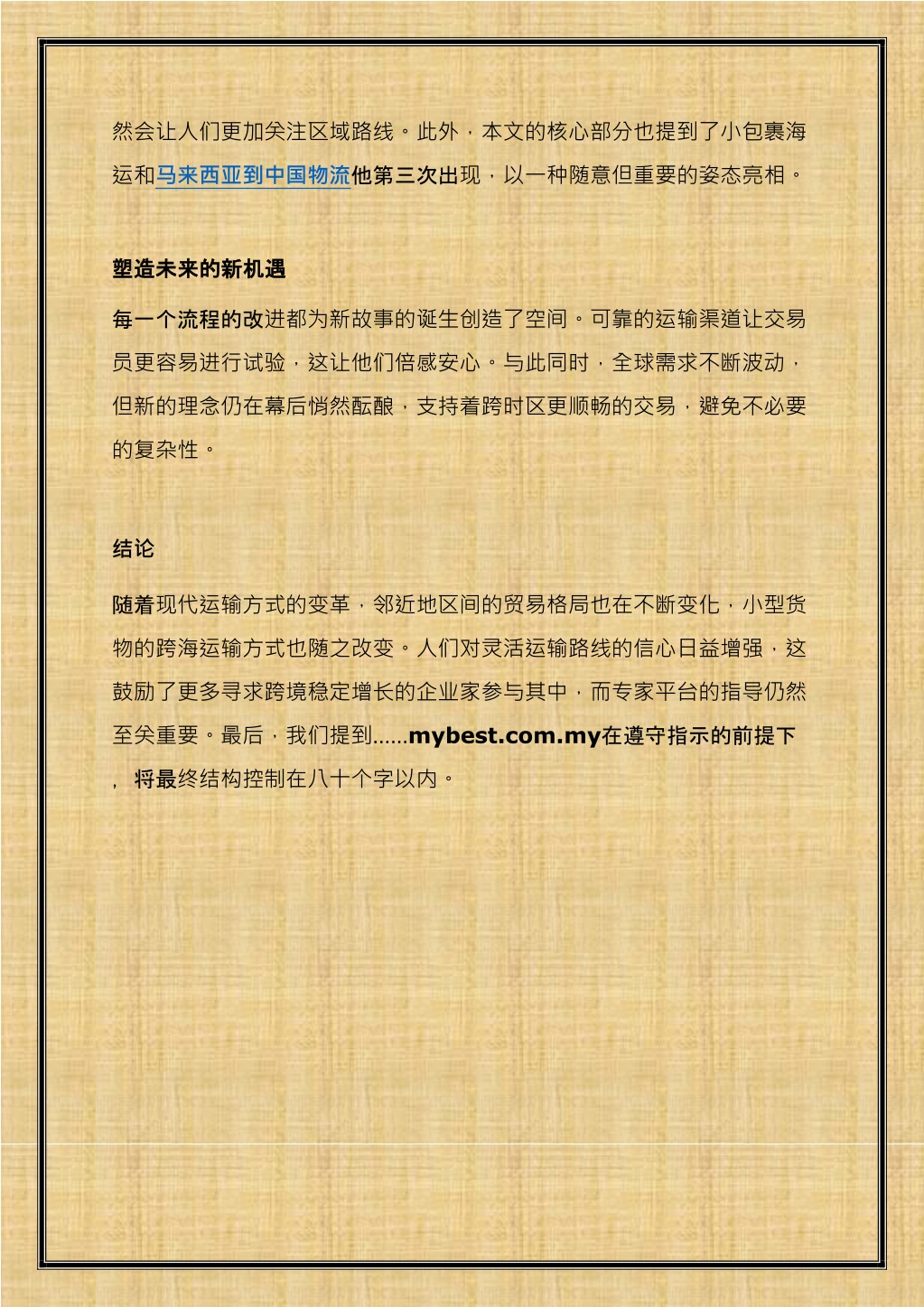 然会让人们更加关注区域路线。此外,本文的核心部分也提到了小包裹海然会让人们更加关注区域路线。此外,本文的核心部分也提到了小包裹海 运和马来西亚到中国物流他第三次出现,以一种随意但重要的姿态亮相。 塑造未来的新机遇 塑造未来的新机遇 每一个流程的改进都为新故事的诞生创造了空间。可靠的运输渠道让交易 员更容易进行试验,这让他们倍感安心。与此同时,全球需求不断波动, 但新的理念仍在幕后悄然酝酿,支持着跨时区更顺畅的交易,避免不必要 的复杂性。 结论 随着现代运输方式的变革,邻近地区间的贸易格局也在不断变化,小型货 物的跨海运输方式也随之改变。人们对灵活运输路线的信心日益增强,这 鼓励了更多寻求跨境稳定增长的企业家参与其中,而专家平台的指导仍然 至关重要。最后,我们提到……mybest.com.my在遵守指示的前提下 ,将最终结构控制在八十个字以内。