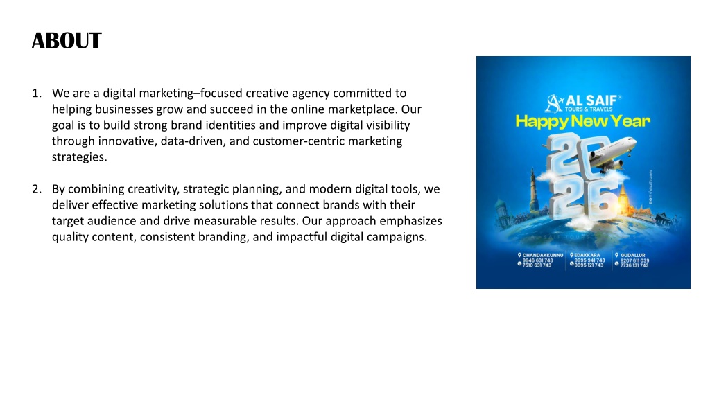 ABOUT 1. We are a digital marketing–focused creative agency committed to helping businesses grow and succeed in the online marketplace. Our goal is to build strong brand identities and improve digital visibility through innovative, data-driven, and customer-centric marketing strategies. 2. By combining creativity, strategic planning, and modern digital tools, we deliver effective marketing solutions that connect brands with their target audience and drive measurable results. Our approach emphasizes quality content, consistent branding, and impactful digital campaigns.