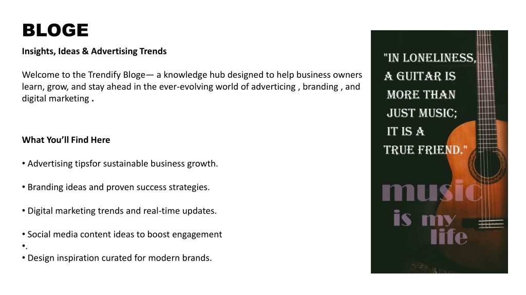 BLOGE Insights, Ideas & Advertising Trends Welcome to the Trendify Bloge— a knowledge hub designed to help business owners learn, grow, and stay ahead in the ever-evolving world of adverticing , branding , and digital marketing . What You’ll Find Here • Advertising tipsfor sustainable business growth. • Branding ideas and proven success strategies. • Digital marketing trends and real-time updates. • Social media content ideas to boost engagement •. • Design inspiration curated for modern brands.