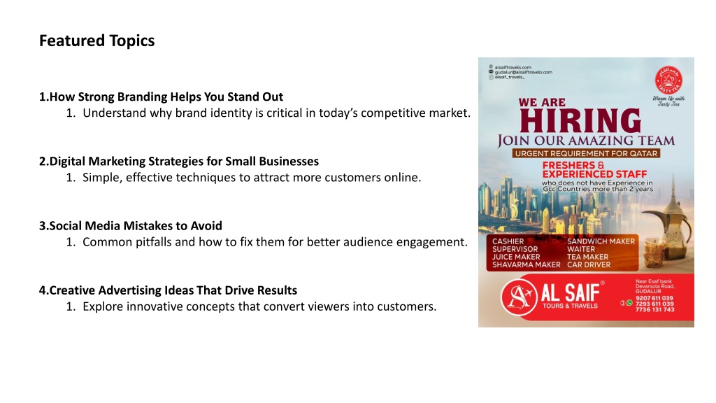Featured Topics 1.How Strong Branding Helps You Stand Out 1. Understand why brand identity is critical in today’s competitive market. 2.Digital Marketing Strategies for Small Businesses 1. Simple, effective techniques to attract more customers online. 3.Social Media Mistakes to Avoid 1. Common pitfalls and how to fix them for better audience engagement. 4.Creative Advertising Ideas That Drive Results 1. Explore innovative concepts that convert viewers into customers.