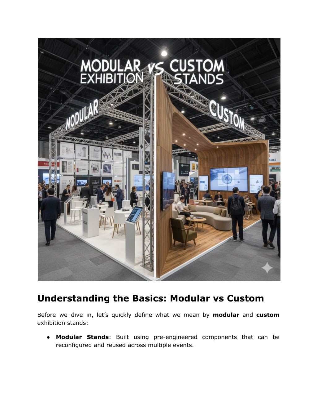 2. Understanding the Basics: Modular vs Custom Before we dive in, let’s quickly define what we mean by modular and custom exhibition stands: ● Modular Stands: Built using pre-engineered components that can be reconfigured and reused across multiple events.
