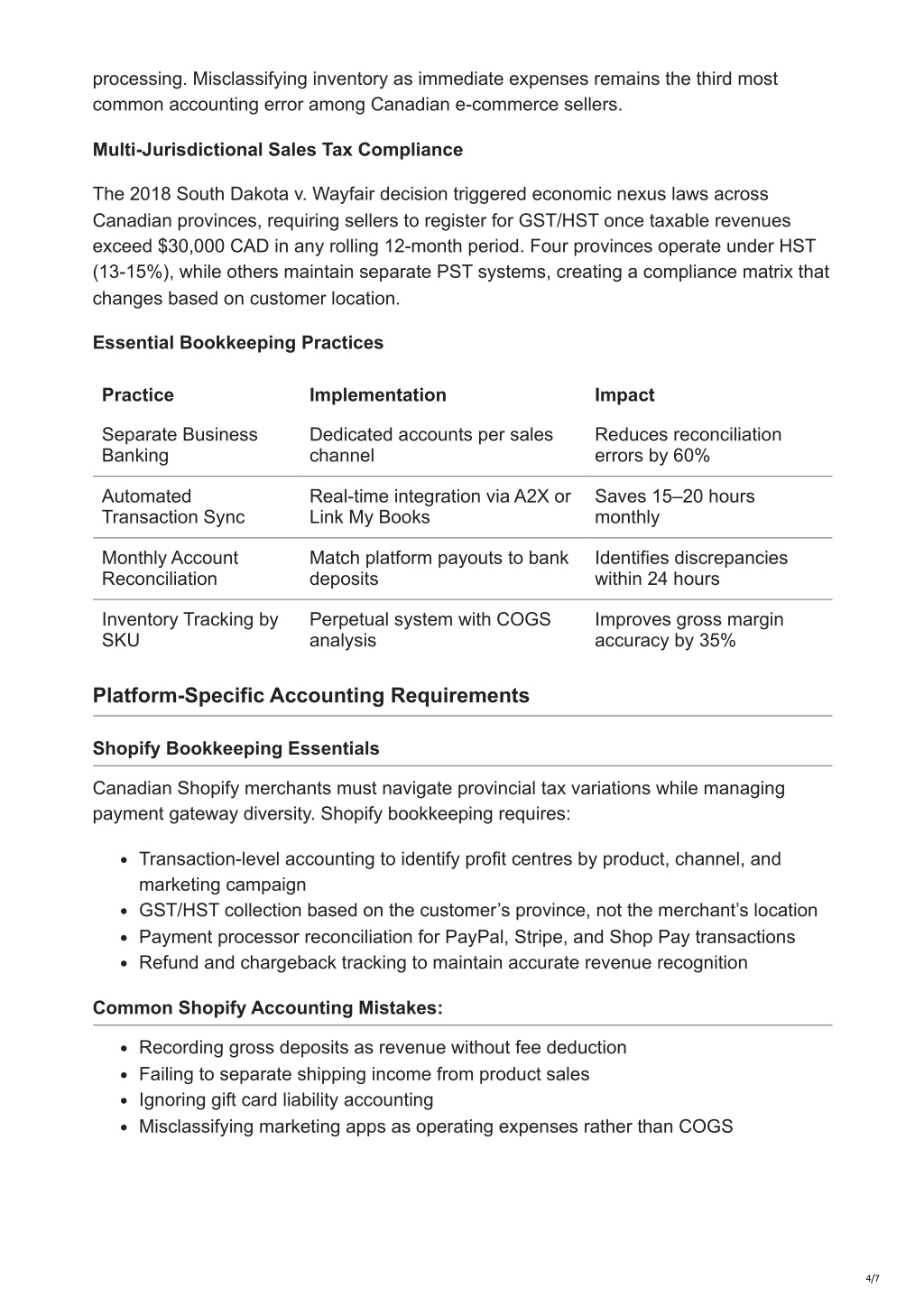 processing. Misclassifying inventory as immediate expenses remains the third most common accounting error among Canadian e-commerce sellers. Multi-Jurisdictional Sales Tax Compliance The 2018 South Dakota v. Wayfair decision triggered economic nexus laws across Canadian provinces, requiring sellers to register for GST/HST once taxable revenues exceed $30,000 CAD in any rolling 12-month period. Four provinces operate under HST (13-15%), while others maintain separate PST systems, creating a compliance matrix that changes based on customer location. Essential Bookkeeping Practices Practice Implementation Impact Separate Business Banking Dedicated accounts per sales channel Reduces reconciliation errors by 60% Automated Transaction Sync Real-time integration via A2X or Link My Books Saves 15–20 hours monthly Monthly Account Reconciliation Match platform payouts to bank deposits Identifies discrepancies within 24 hours Inventory Tracking by SKU Perpetual system with COGS analysis Improves gross margin accuracy by 35% Platform-Specific Accounting Requirements Shopify Bookkeeping Essentials Canadian Shopify merchants must navigate provincial tax variations while managing payment gateway diversity. Shopify bookkeeping requires: Transaction-level accounting to identify profit centres by product, channel, and marketing campaign GST/HST collection based on the customer’s province, not the merchant’s location Payment processor reconciliation for PayPal, Stripe, and Shop Pay transactions Refund and chargeback tracking to maintain accurate revenue recognition Common Shopify Accounting Mistakes: Recording gross deposits as revenue without fee deduction Failing to separate shipping income from product sales Ignoring gift card liability accounting Misclassifying marketing apps as operating expenses rather than COGS 4/7