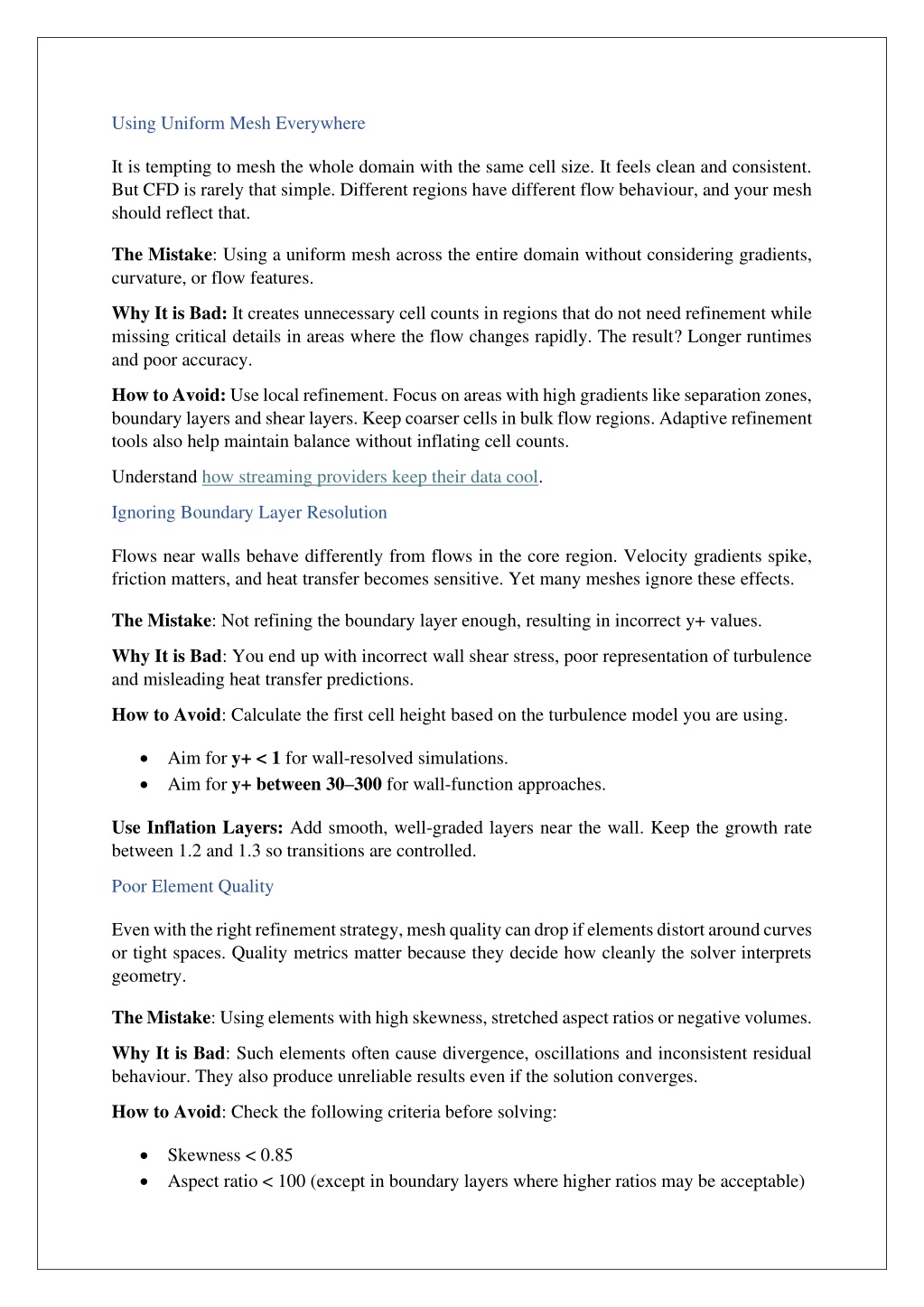 2. Using Uniform Mesh Everywhere It is tempting to mesh the whole domain with the same cell size. It feels clean and consistent. But CFD is rarely that simple. Different regions have different flow behaviour, and your mesh should reflect that. The Mistake: Using a uniform mesh across the entire domain without considering gradients, curvature, or flow features. Why It is Bad: It creates unnecessary cell counts in regions that do not need refinement while missing critical details in areas where the flow changes rapidly. The result? Longer runtimes and poor accuracy. How to Avoid: Use local refinement. Focus on areas with high gradients like separation zones, boundary layers and shear layers. Keep coarser cells in bulk flow regions. Adaptive refinement tools also help maintain balance without inflating cell counts. Understand how streaming providers keep their data cool. Ignoring Boundary Layer Resolution Flows near walls behave differently from flows in the core region. Velocity gradients spike, friction matters, and heat transfer becomes sensitive. Yet many meshes ignore these effects. The Mistake: Not refining the boundary layer enough, resulting in incorrect y+ values. Why It is Bad: You end up with incorrect wall shear stress, poor representation of turbulence and misleading heat transfer predictions. How to Avoid: Calculate the first cell height based on the turbulence model you are using. •Aim for y+ < 1 for wall-resolved simulations. •Aim for y+ between 30–300 for wall-function approaches. Use Inflation Layers: Add smooth, well-graded layers near the wall. Keep the growth rate between 1.2 and 1.3 so transitions are controlled. Poor Element Quality Even with the right refinement strategy, mesh quality can drop if elements distort around curves or tight spaces. Quality metrics matter because they decide how cleanly the solver interprets geometry. The Mistake: Using elements with high skewness, stretched aspect ratios or negative volumes. Why It is Bad: Such elements often cause divergence, oscillations and inconsistent residual behaviour. They also produce unreliable results even if the solution converges. How to Avoid: Check the following criteria before solving: •Skewness < 0.85 •Aspect ratio < 100 (except in boundary layers where higher ratios may be acceptable)