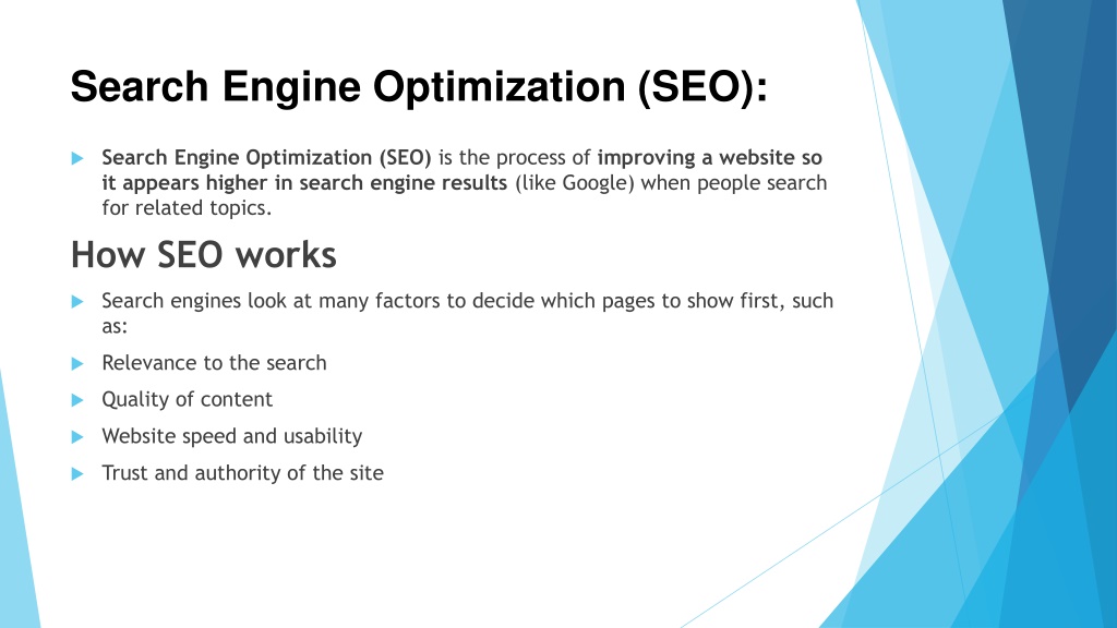 8. Search Engine Optimization (SEO):  Search Engine Optimization (SEO) is the process of improving a website so it appears higher in search engine results (like Google) when people search for related topics. How SEO works  Search engines look at many factors to decide which pages to show first, such as:  Relevance to the search  Quality of content  Website speed and usability  Trust and authority of the site