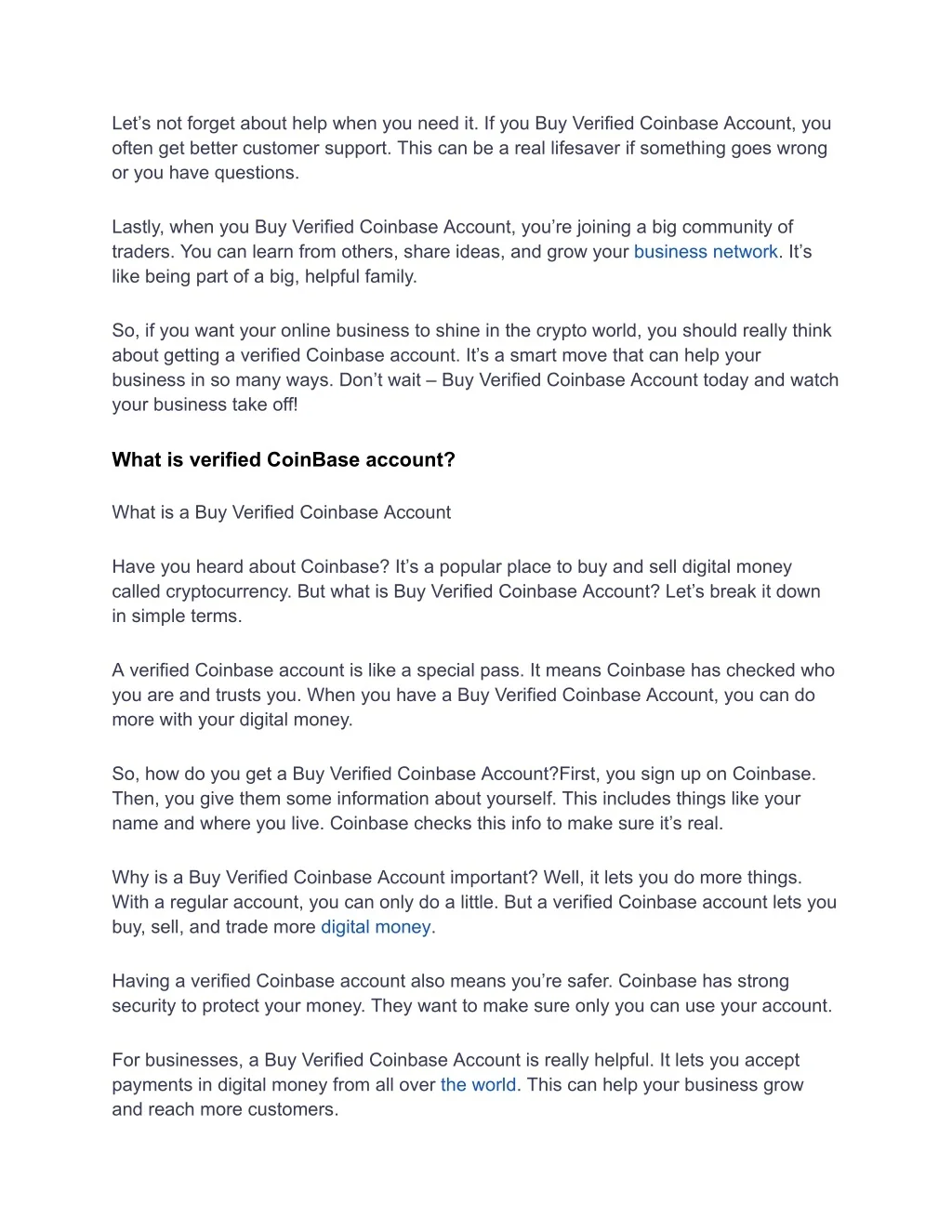 Let’s not forget about help when you need it. If you Buy Verified Coinbase Account, you often get better customer support. This can be a real lifesaver if something goes wrong or you have questions. Lastly, when you Buy Verified Coinbase Account, you’re joining a big community of traders. You can learn from others, share ideas, and grow your business network. It’s like being part of a big, helpful family. So, if you want your online business to shine in the crypto world, you should really think about getting a verified Coinbase account. It’s a smart move that can help your business in so many ways. Don’t wait – Buy Verified Coinbase Account today and watch your business take off! What is verified CoinBase account? What is a Buy Verified Coinbase Account Have you heard about Coinbase? It’s a popular place to buy and sell digital money called cryptocurrency. But what is Buy Verified Coinbase Account? Let’s break it down in simple terms. A verified Coinbase account is like a special pass. It means Coinbase has checked who you are and trusts you. When you have a Buy Verified Coinbase Account, you can do more with your digital money. So, how do you get a Buy Verified Coinbase Account?First, you sign up on Coinbase. Then, you give them some information about yourself. This includes things like your name and where you live. Coinbase checks this info to make sure it’s real. Why is a Buy Verified Coinbase Account important? Well, it lets you do more things. With a regular account, you can only do a little. But a verified Coinbase account lets you buy, sell, and trade more digital money. Having a verified Coinbase account also means you’re safer. Coinbase has strong security to protect your money. They want to make sure only you can use your account. For businesses, a Buy Verified Coinbase Account is really helpful. It lets you accept payments in digital money from all over the world. This can help your business grow and reach more customers.
