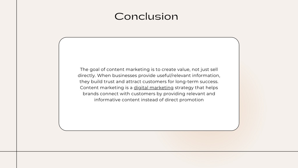 10. Conclusion The goal of content marketing is to create value, not just sell directly. When businesses provide useful/relevant information, they build trust and attract customers for long-term success. Content marketing is a digital marketing strategy that helps brands connect with customers by providing relevant and informative content instead of direct promotion