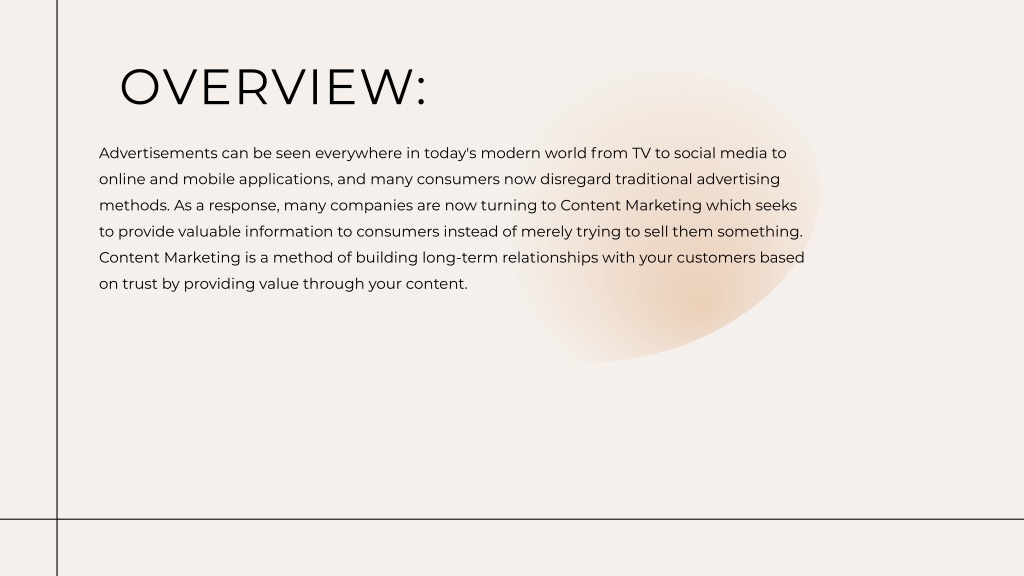 2. OVERVIEW: Advertisements can be seen everywhere in today's modern world from TV to social media to online and mobile applications, and many consumers now disregard traditional advertising methods. As a response, many companies are now turning to Content Marketing which seeks to provide valuable information to consumers instead of merely trying to sell them something. Content Marketing is a method of building long-term relationships with your customers based on trust by providing value through your content.