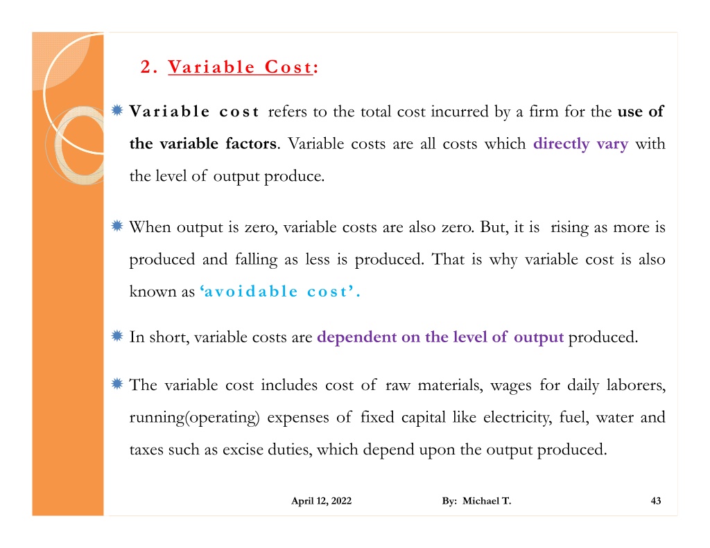 2. Variable Cost: Variable cost refers to the total cost incurred by a firm for the use of the variable factors. Variable costs are all costs which directly vary with the level of output produce. When output is zero, variable costs are also zero. But, it is rising as more is produced and falling as less is produced. That is why variable cost is also known as ‘avoidable cost’. In short, variable costs are dependent on the level of output produced. The variable cost includes cost of raw materials, wages for daily laborers, running(operating) expenses of fixed capital like electricity, fuel, water and taxes such as excise duties, which depend upon the output produced. April 12, 2022 By: Michael T. 43
