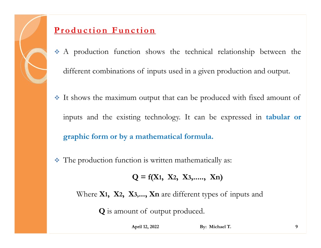 4.1 T H E O RY O F P RO D U C T I O N Basic Concepts of Production Raw materials yield less satisfaction to the consumer by themselves. In order to get better utility from raw materials, they must be transformed into outputs. Production: is the process of transforming or converting resources (or inputs) into commodities (or outputs). It can also be defined as an act of creating value or utility. Precisely, production is the process of combining inputs to make outputs. Input Production Output April 12, 2022 By: Michael T. 4