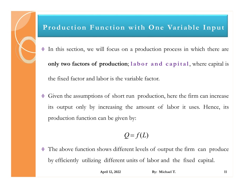 Production Function with One Variable Input In this section, we will focus on a production process in which there are only two factors of production; labor and capital, where capital is the fixed factor and labor is the variable factor. Given the assumptions of short run production, here the firm can increase its output only by increasing the amount of labor it uses. Hence, its production function can be given by: Q f (L ) The above function shows different levels of output the firm can produce by efficiently utilizing different units of labor and the fixed capital. April 12, 2022 By: Michael T. 11