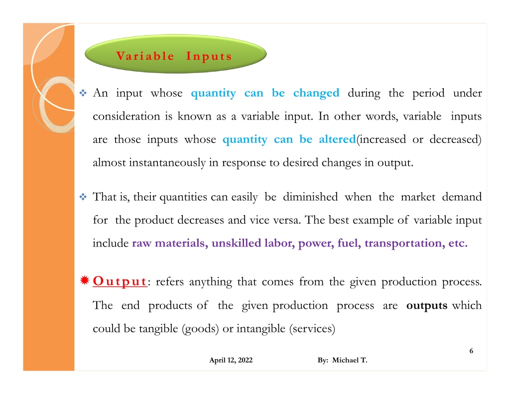 Variable Inputs An input whose quantity can be changed during the period under consideration is known as a variable input. In other words, variable inputs are those inputs whose quantity can be altered(increased or decreased) almost instantaneously in response to desired changes in output. That is, their quantities can easily be diminished when the market demand for the product decreases and vice versa. The best example of variable input include raw materials, unskilled labor, power, fuel, transportation, etc. Output: refers anything that comes from the given production process. The end products of the given production process are outputs which could be tangible (goods) or intangible (services) 6 April 12, 2022 By: Michael T.