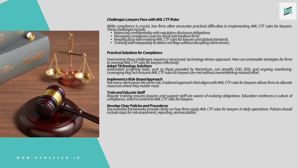 Challenges Lawyers Face with AML CTF Rules • While compliance is crucial, law firms often encounter practical difficulties in implementing AML CTF rules for lawyers. These challenges include: • Balancing confidentiality with regulatory disclosure obligations. • Managing compliance costs for small and medium firms. • Keeping pace with evolving AML CTF rules for lawyers and global standards. • Training staff adequately to detect red flags without disrupting client service. • Practical Solutions for Compliance • Overcoming these challenges requires a structured, technology-driven approach. Here are actionable strategies for firms to manage AML CTF rules for lawyers effectively: • Adopt Technology Solutions • Automated screening tools, such as those provided by NameScan, can simplify CDD, EDD, and ongoing monitoring. Leveraging RegTech ensures AML CTF rules for lawyers are met without overwhelming manual effort. • Implement a Risk-Based Approach • Not every client poses the same risk. A tailored approach that aligns with AML CTF rules for lawyers allows firms to allocate resources where they matter most. • Train and Educate Staff • Regular training ensures lawyers and support staff are aware of evolving obligations. Education reinforces a culture of compliance, which is central to AML CTF rules for lawyers. • Develop Clear Policies and Procedures • Documented frameworks provide clarity on how firms apply AML CTF rules for lawyers in daily operations. Policies should include steps for risk assessment, reporting, and escalation. WWW.NAMESCAN.IO