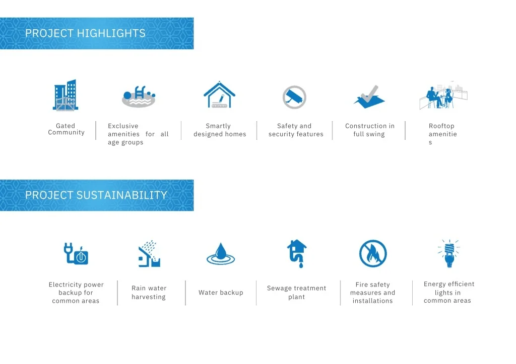 PROJECT HIGHLIGHTS Gated Community Exclusive amenities for all age groups Smartly designed homes Safety and security features Construction in full swing Rooftop amenitie s PROJECT SUSTAINABILITY Energy efficient lights in common areas Electricity power backup for common areas Fire safety measures and installations Rain water harvesting Sewage treatment plant Water backup