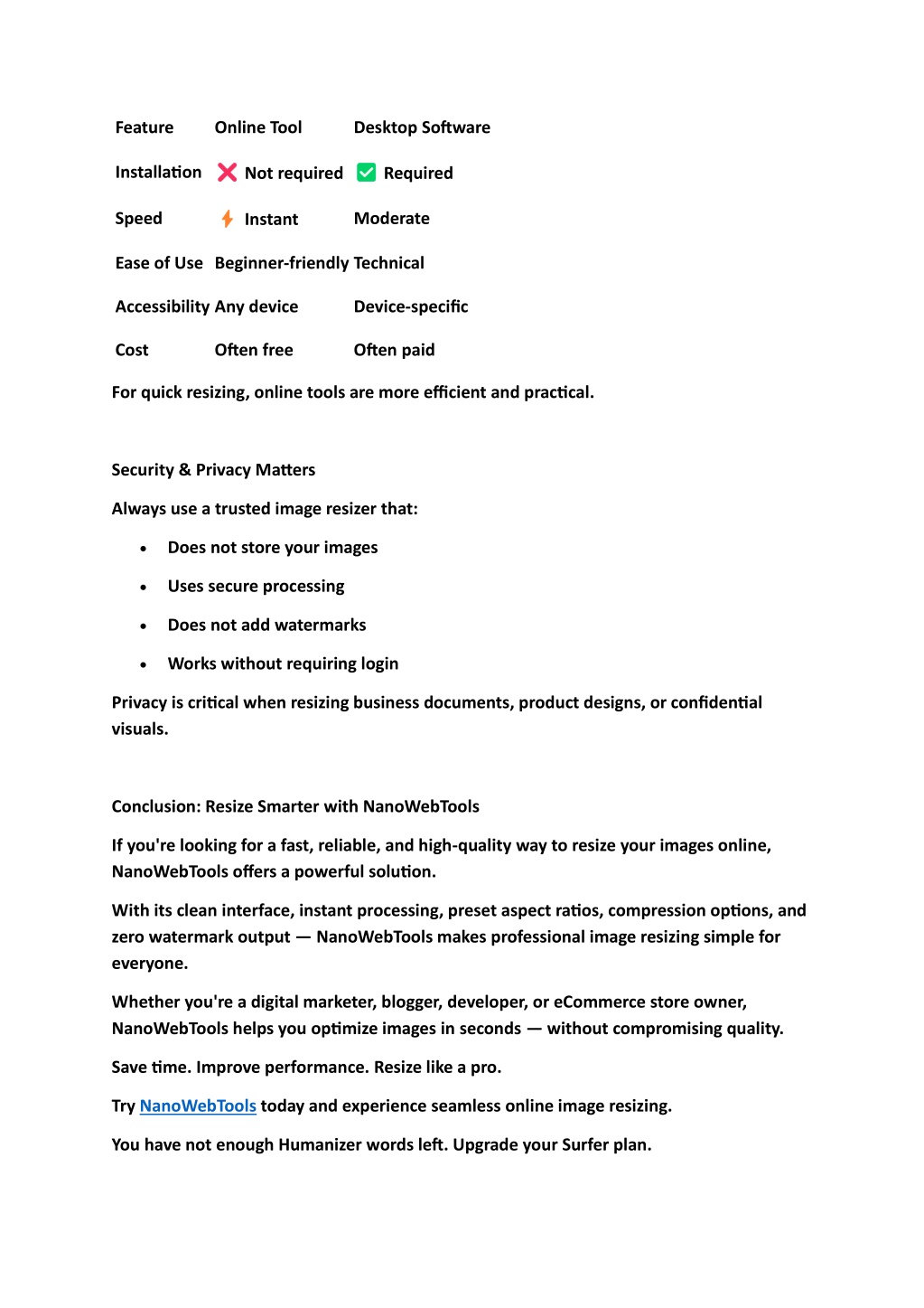 Feature Online Tool Desktop Software Installation Not required Required Speed Moderate Instant Ease of UseBeginner-friendlyTechnical AccessibilityAny device Device-specific Cost Often free Often paid For quick resizing, online tools are more efficient and practical. Security & Privacy Matters Always use a trusted image resizer that: •Does not store your images •Uses secure processing •Does not add watermarks •Works without requiring login Privacy is critical when resizing business documents, product designs, or confidential visuals. Conclusion: Resize Smarter with NanoWebTools If you're looking for a fast, reliable, and high-quality way to resize your images online, NanoWebTools offers a powerful solution. With its clean interface, instant processing, preset aspect ratios, compression options, and zero watermark output — NanoWebTools makes professional image resizing simple for everyone. Whether you're a digital marketer, blogger, developer, or eCommerce store owner, NanoWebTools helps you optimize images in seconds — without compromising quality. Save time. Improve performance. Resize like a pro. Try NanoWebTools today and experience seamless online image resizing. You have not enough Humanizer words left. Upgrade your Surfer plan.