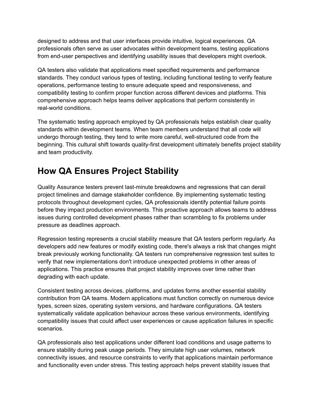 designed to address and that user interfaces provide intuitive, logical experiences. QA professionals often serve as user advocates within development teams, testing applications from end-user perspectives and identifying usability issues that developers might overlook. QA testers also validate that applications meet specified requirements and performance standards. They conduct various types of testing, including functional testing to verify feature operations, performance testing to ensure adequate speed and responsiveness, and compatibility testing to confirm proper function across different devices and platforms. This comprehensive approach helps teams deliver applications that perform consistently in real-world conditions. The systematic testing approach employed by QA professionals helps establish clear quality standards within development teams. When team members understand that all code will undergo thorough testing, they tend to write more careful, well-structured code from the beginning. This cultural shift towards quality-first development ultimately benefits project stability and team productivity. How QA Ensures Project Stability Quality Assurance testers prevent last-minute breakdowns and regressions that can derail project timelines and damage stakeholder confidence. By implementing systematic testing protocols throughout development cycles, QA professionals identify potential failure points before they impact production environments. This proactive approach allows teams to address issues during controlled development phases rather than scrambling to fix problems under pressure as deadlines approach. Regression testing represents a crucial stability measure that QA testers perform regularly. As developers add new features or modify existing code, there's always a risk that changes might break previously working functionality. QA testers run comprehensive regression test suites to verify that new implementations don't introduce unexpected problems in other areas of applications. This practice ensures that project stability improves over time rather than degrading with each update. Consistent testing across devices, platforms, and updates forms another essential stability contribution from QA teams. Modern applications must function correctly on numerous device types, screen sizes, operating system versions, and hardware configurations. QA testers systematically validate application behaviour across these various environments, identifying compatibility issues that could affect user experiences or cause application failures in specific scenarios. QA professionals also test applications under different load conditions and usage patterns to ensure stability during peak usage periods. They simulate high user volumes, network connectivity issues, and resource constraints to verify that applications maintain performance and functionality even under stress. This testing approach helps prevent stability issues that