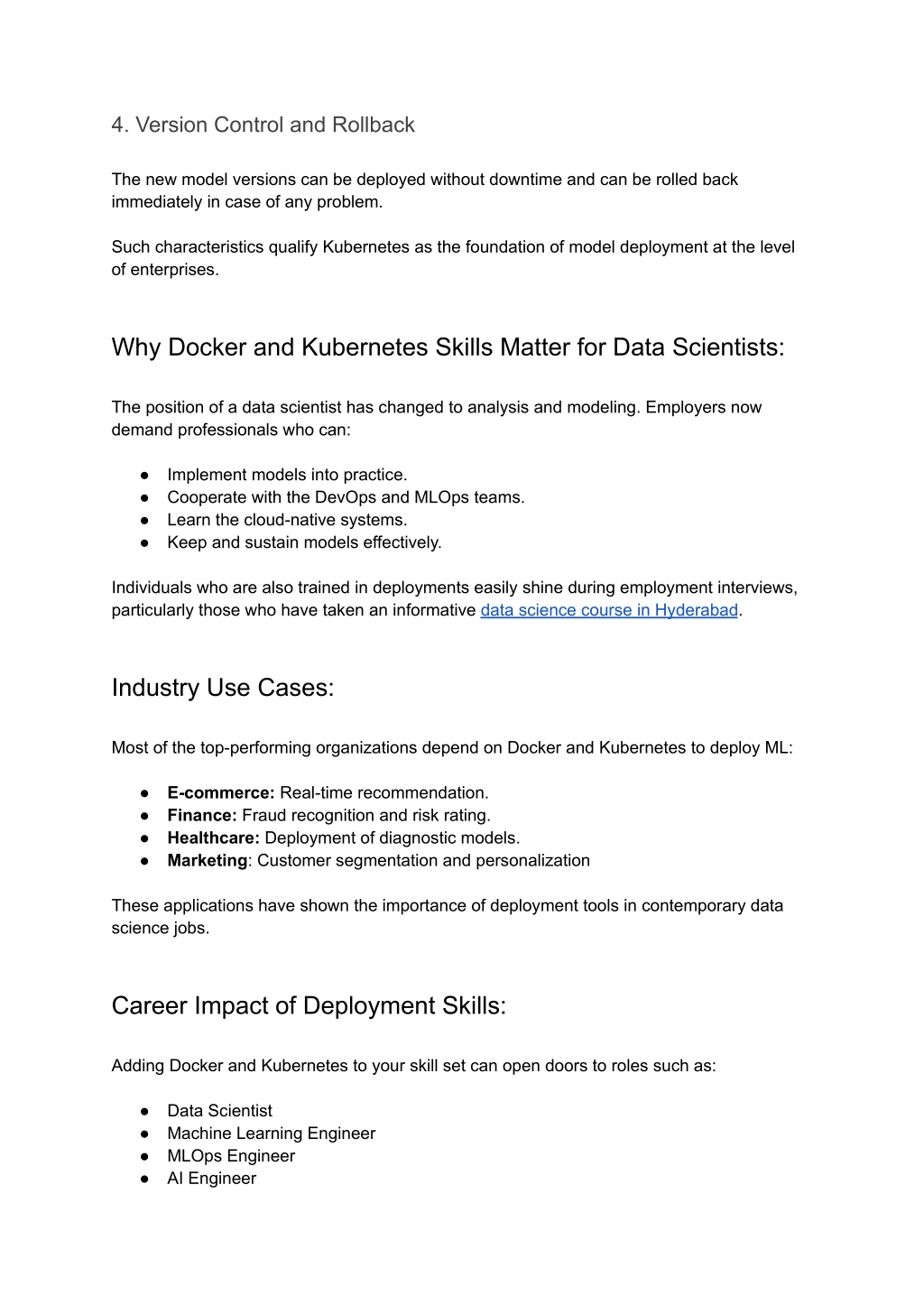 4. Version Control and Rollback The new model versions can be deployed without downtime and can be rolled back immediately in case of any problem. Such characteristics qualify Kubernetes as the foundation of model deployment at the level of enterprises. Why Docker and Kubernetes Skills Matter for Data Scientists: The position of a data scientist has changed to analysis and modeling. Employers now demand professionals who can: ● Implement models into practice. ● Cooperate with the DevOps and MLOps teams. ● Learn the cloud-native systems. ● Keep and sustain models effectively. Individuals who are also trained in deployments easily shine during employment interviews, particularly those who have taken an informative data science course in Hyderabad. Industry Use Cases: Most of the top-performing organizations depend on Docker and Kubernetes to deploy ML: ● E-commerce: Real-time recommendation. ● Finance: Fraud recognition and risk rating. ● Healthcare: Deployment of diagnostic models. ● Marketing: Customer segmentation and personalization These applications have shown the importance of deployment tools in contemporary data science jobs. Career Impact of Deployment Skills: Adding Docker and Kubernetes to your skill set can open doors to roles such as: ● Data Scientist ● Machine Learning Engineer ● MLOps Engineer ● AI Engineer