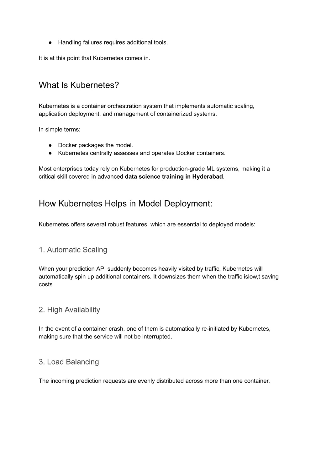 ● Handling failures requires additional tools. It is at this point that Kubernetes comes in. What Is Kubernetes? Kubernetes is a container orchestration system that implements automatic scaling, application deployment, and management of containerized systems. In simple terms: ● Docker packages the model. ● Kubernetes centrally assesses and operates Docker containers. Most enterprises today rely on Kubernetes for production-grade ML systems, making it a critical skill covered in advanced data science training in Hyderabad. How Kubernetes Helps in Model Deployment: Kubernetes offers several robust features, which are essential to deployed models: 1. Automatic Scaling When your prediction API suddenly becomes heavily visited by traffic, Kubernetes will automatically spin up additional containers. It downsizes them when the traffic islow,t saving costs. 2. High Availability In the event of a container crash, one of them is automatically re-initiated by Kubernetes, making sure that the service will not be interrupted. 3. Load Balancing The incoming prediction requests are evenly distributed across more than one container.