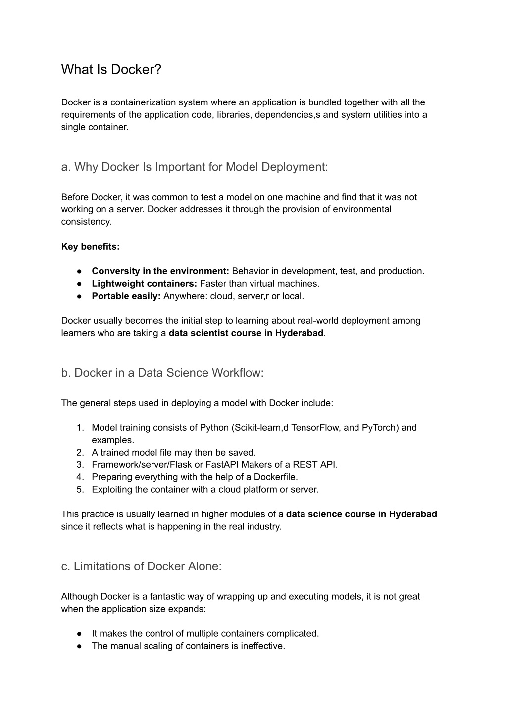 What Is Docker? Docker is a containerization system where an application is bundled together with all the requirements of the application code, libraries, dependencies,s and system utilities into a single container. a. Why Docker Is Important for Model Deployment: Before Docker, it was common to test a model on one machine and find that it was not working on a server. Docker addresses it through the provision of environmental consistency. Key benefits: ● Conversity in the environment: Behavior in development, test, and production. ● Lightweight containers: Faster than virtual machines. ● Portable easily: Anywhere: cloud, server,r or local. Docker usually becomes the initial step to learning about real-world deployment among learners who are taking a data scientist course in Hyderabad. b. Docker in a Data Science Workflow: The general steps used in deploying a model with Docker include: 1. Model training consists of Python (Scikit-learn,d TensorFlow, and PyTorch) and examples. 2. A trained model file may then be saved. 3. Framework/server/Flask or FastAPI Makers of a REST API. 4. Preparing everything with the help of a Dockerfile. 5. Exploiting the container with a cloud platform or server. This practice is usually learned in higher modules of a data science course in Hyderabad since it reflects what is happening in the real industry. c. Limitations of Docker Alone: Although Docker is a fantastic way of wrapping up and executing models, it is not great when the application size expands: ● It makes the control of multiple containers complicated. ● The manual scaling of containers is ineffective.