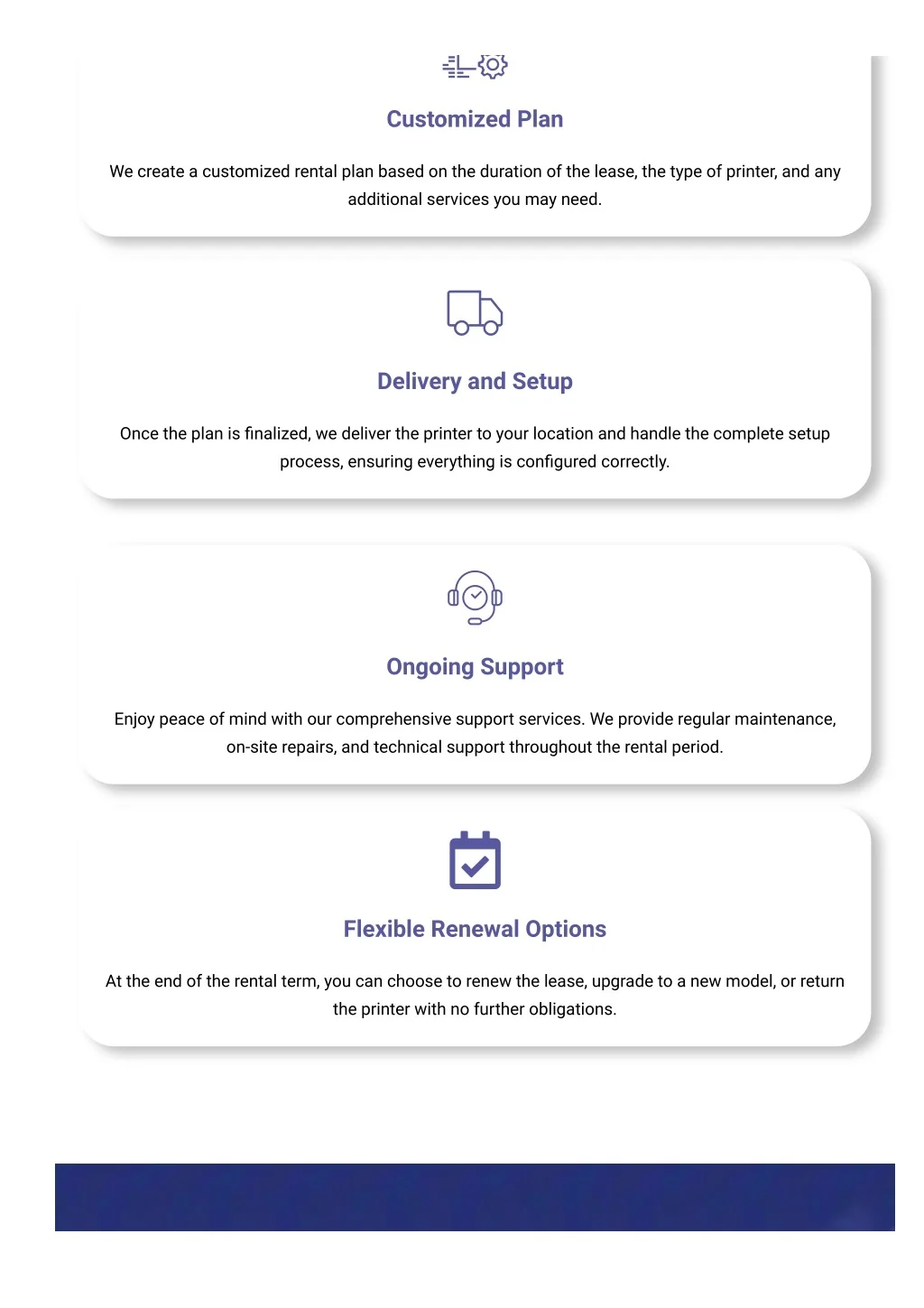 Customized Plan We create a customized rental plan based on the duration of the lease, the type of printer, and any additional services you may need. Delivery and Setup Once the plan is ?nalized, we deliver the printer to your location and handle the complete setup process, ensuring everything is con?gured correctly. Ongoing Support Enjoy peace of mind with our comprehensive support services. We provide regular maintenance, on-site repairs, and technical support throughout the rental period. Flexible Renewal Options At the end of the rental term, you can choose to renew the lease, upgrade to a new model, or return the printer with no further obligations.
