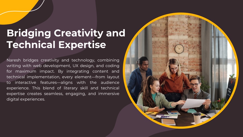 Bridging Creativity and Technical Expertise Naresh bridges creativity and technology, combining writing with web development, UX design, and coding for maximum impact. By integrating content and technical implementation, every element—from layout to interactive features—aligns with the audience experience. This blend of literary skill and technical expertise creates seamless, engaging, and immersive digital experiences.
