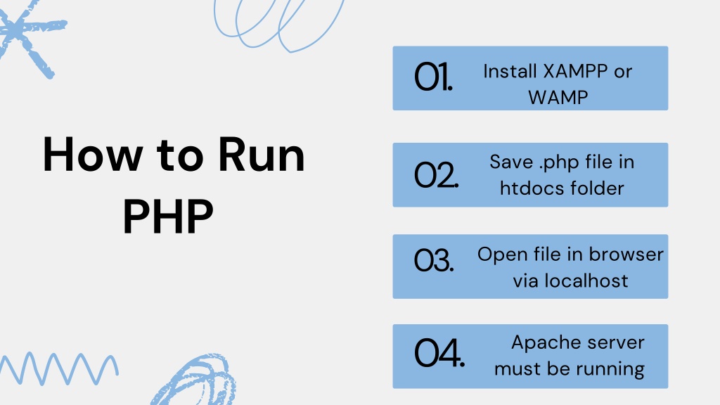 Install XAMPP or WAMP 01. How to Run PHP • Lorem ipsum dolor sit amet, consectetur adipiscing elit, sed do eiusmod tempor incididunt ut labore et dolore magna aliqua. Ut enim ad minim veniam, quis nostrud exercitation ullamco laboris nisi ut aliquip ex ea commodo consequat. • Save .php file in htdocs folder 02. • Open file in browser via localhost 03. • Apache server must be running 04.
