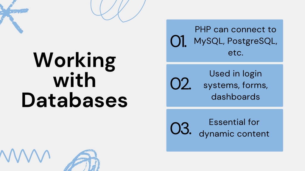 PHP can connect to MySQL, PostgreSQL, etc. 01. Working with Databases • Used in login systems, forms, dashboards 02. • Essential for dynamic content 03.